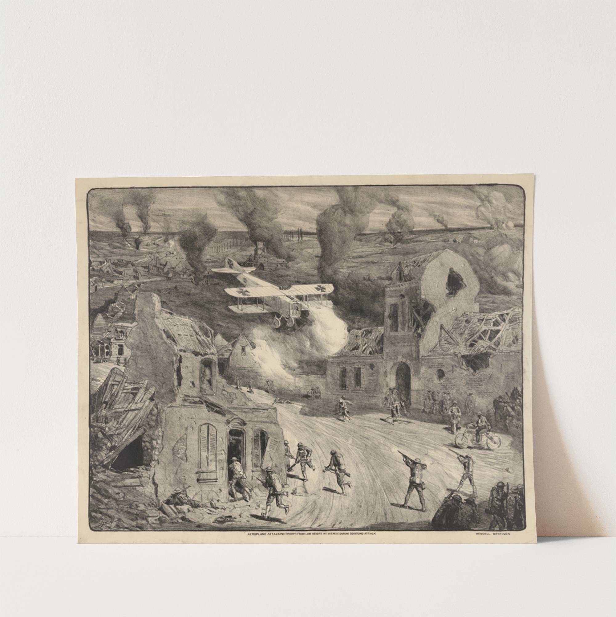 Aeroplane attacking troops from low height at Vierzy during Soissons attack (1927) by Lucien Jonas - Wall Art Print