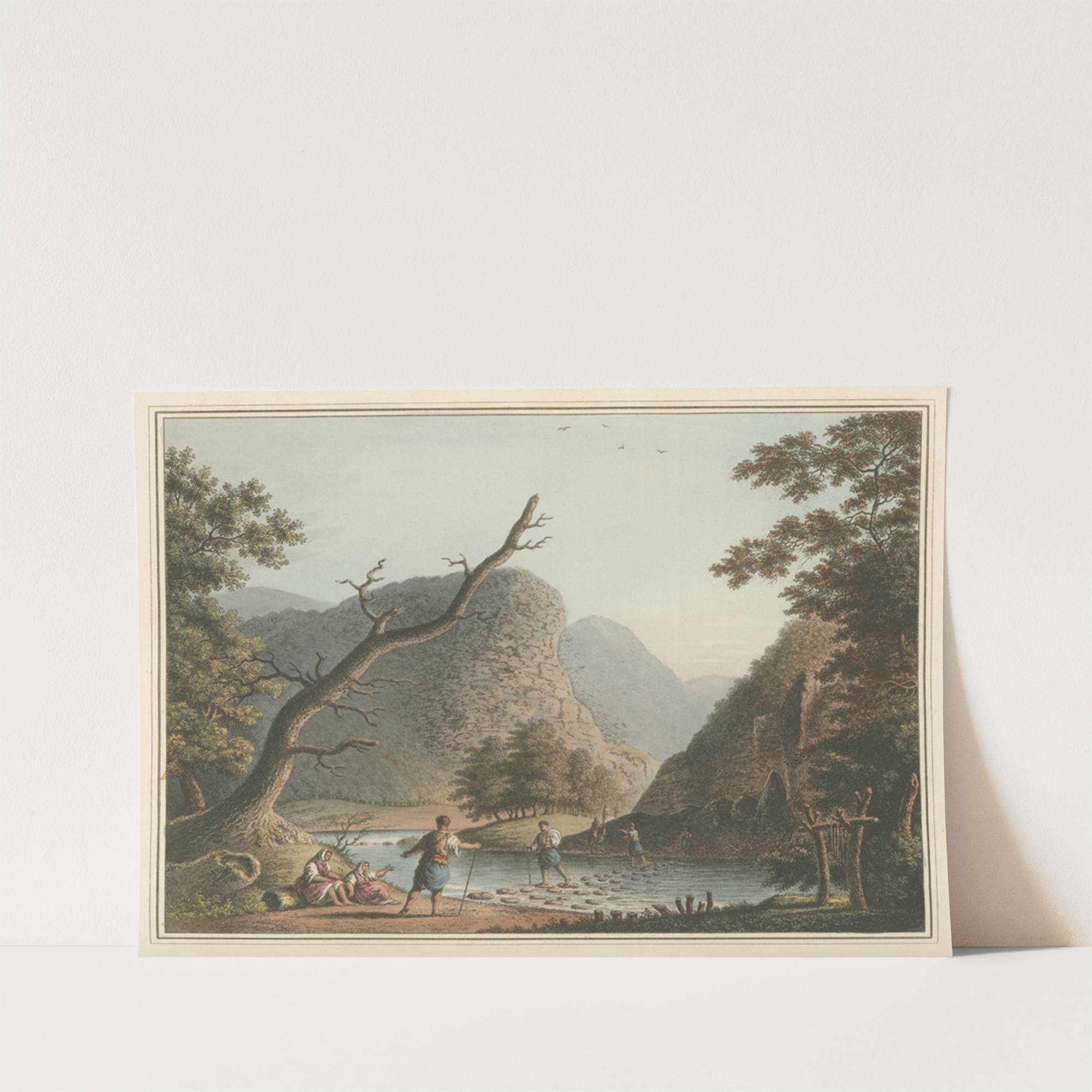 This art print features "Mount Balkan" by Luigi Mayer, showcasing a serene mountainous landscape with detailed realism. The composition centers around a tranquil river meandering through lush greenery, framed by towering rocky cliffs in the background. In the foreground, a...