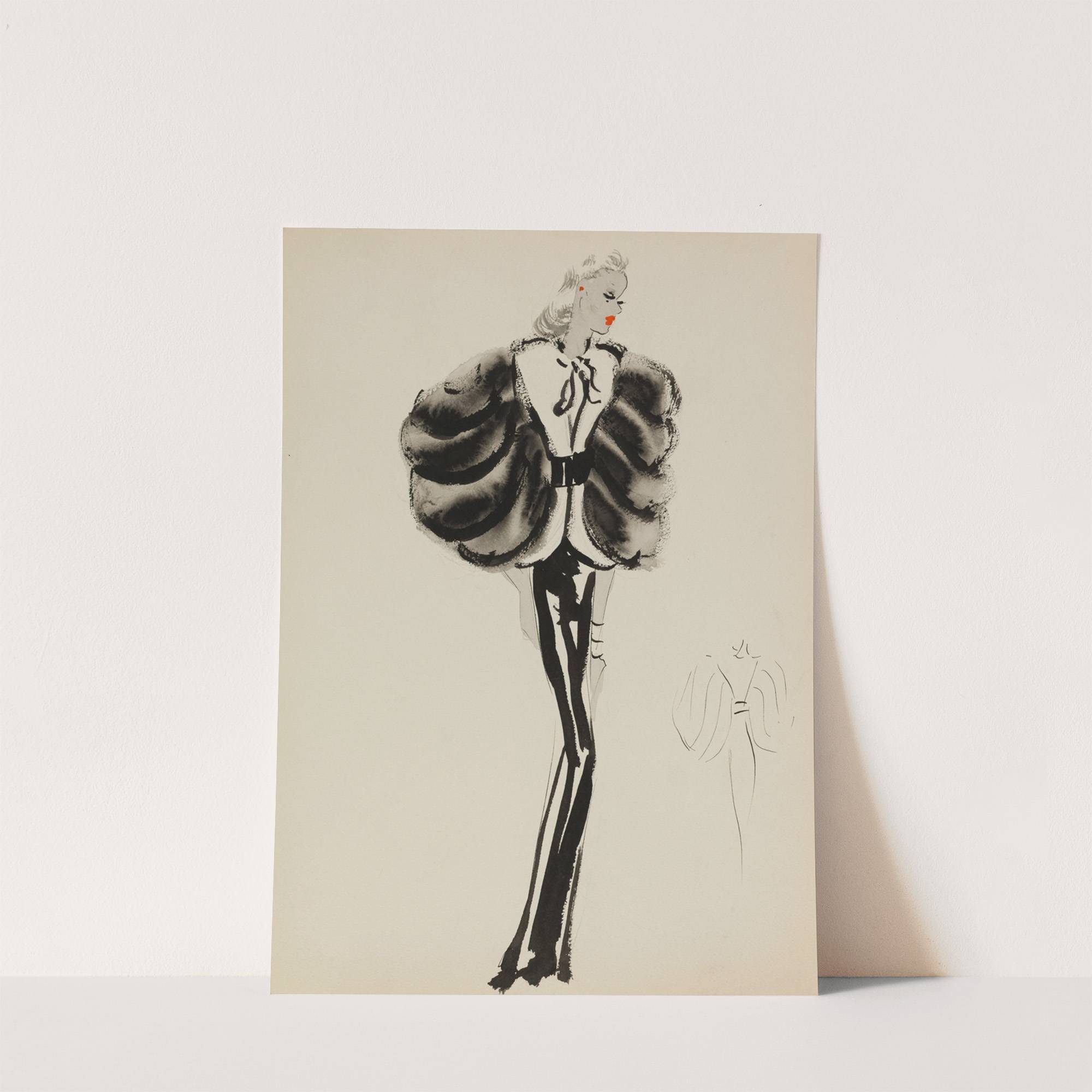 Manteau court blanc avec manches en fourrure noire travaillée en bandes sur robe noire (1938) by M. P. Leven - Wall Art Print