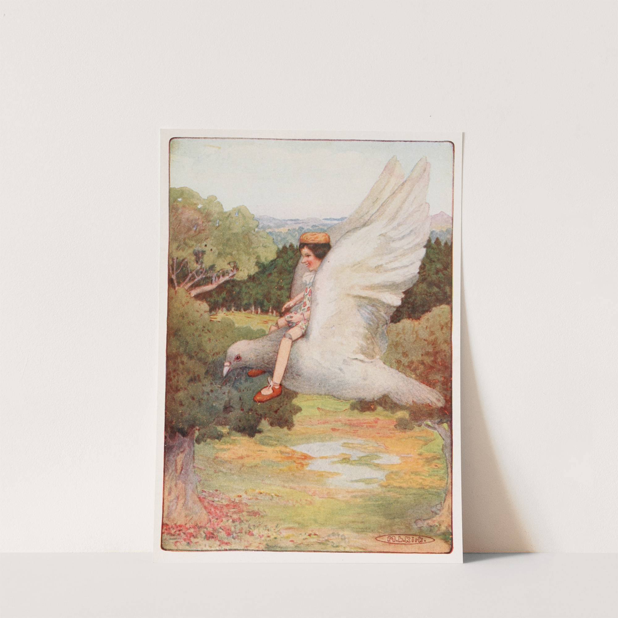 This beautifully rendered artwork, "Gallop, Gallop, My Little Horse," by Maria Louise Kirk, captures a magical moment of a young girl riding a majestic white pigeon through an idyllic forest landscape. The painting utilizes a delicate pastel color palette to...