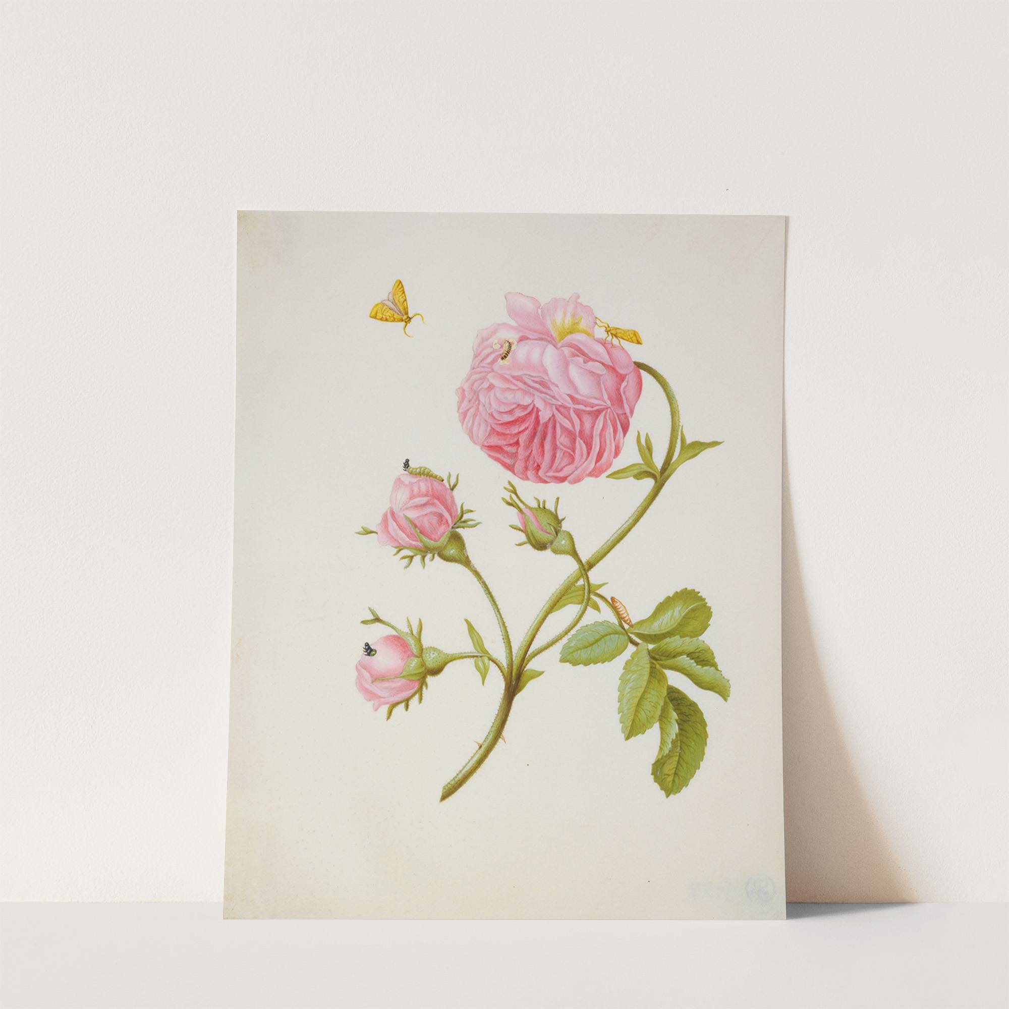 Rose with Metamorphosis of Leaf Roller and a Glued Beetle Larva by Maria Sibylla Merian - Wall Art Print