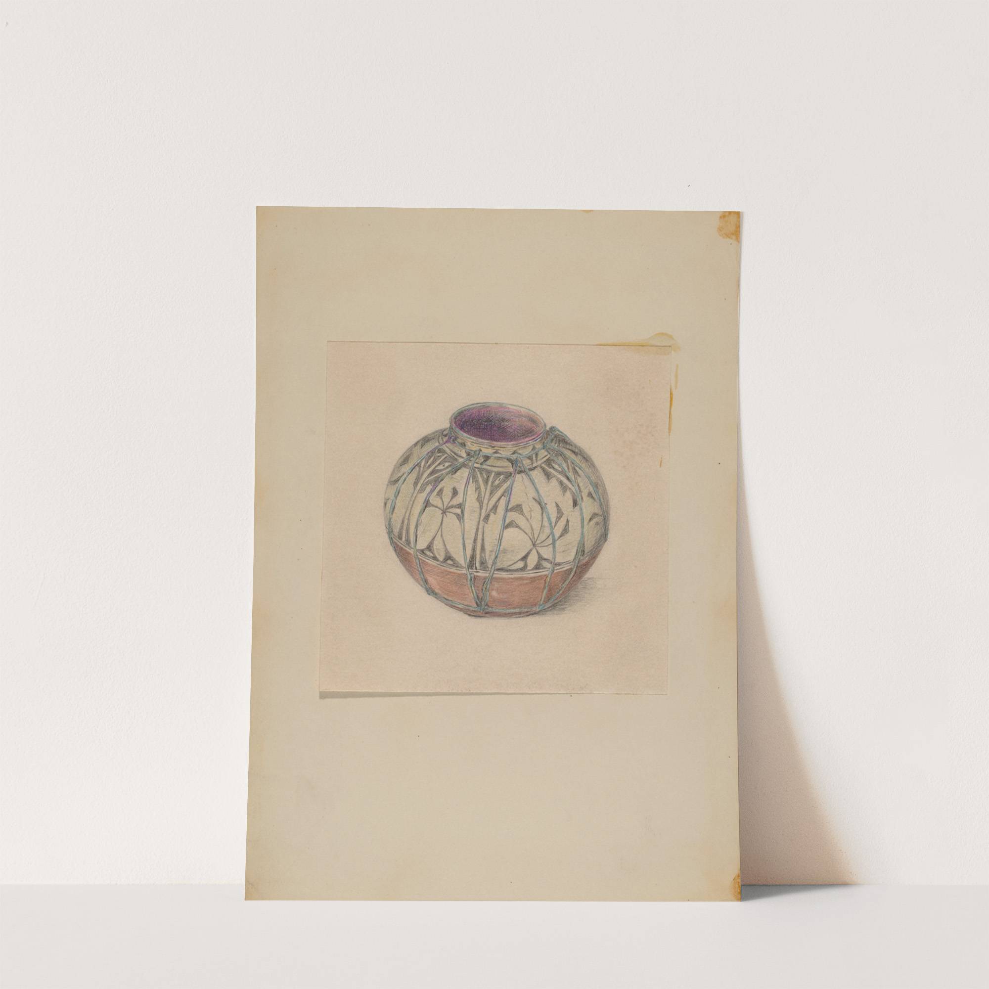 This art print features "Vessel" by Mary Berner, a beautifully intricate drawing rendered in delicate watercolor. The subject is a round ceramic vessel with an elegant and contemporary design. The vase has a spherical shape, with a slightly flattened top...