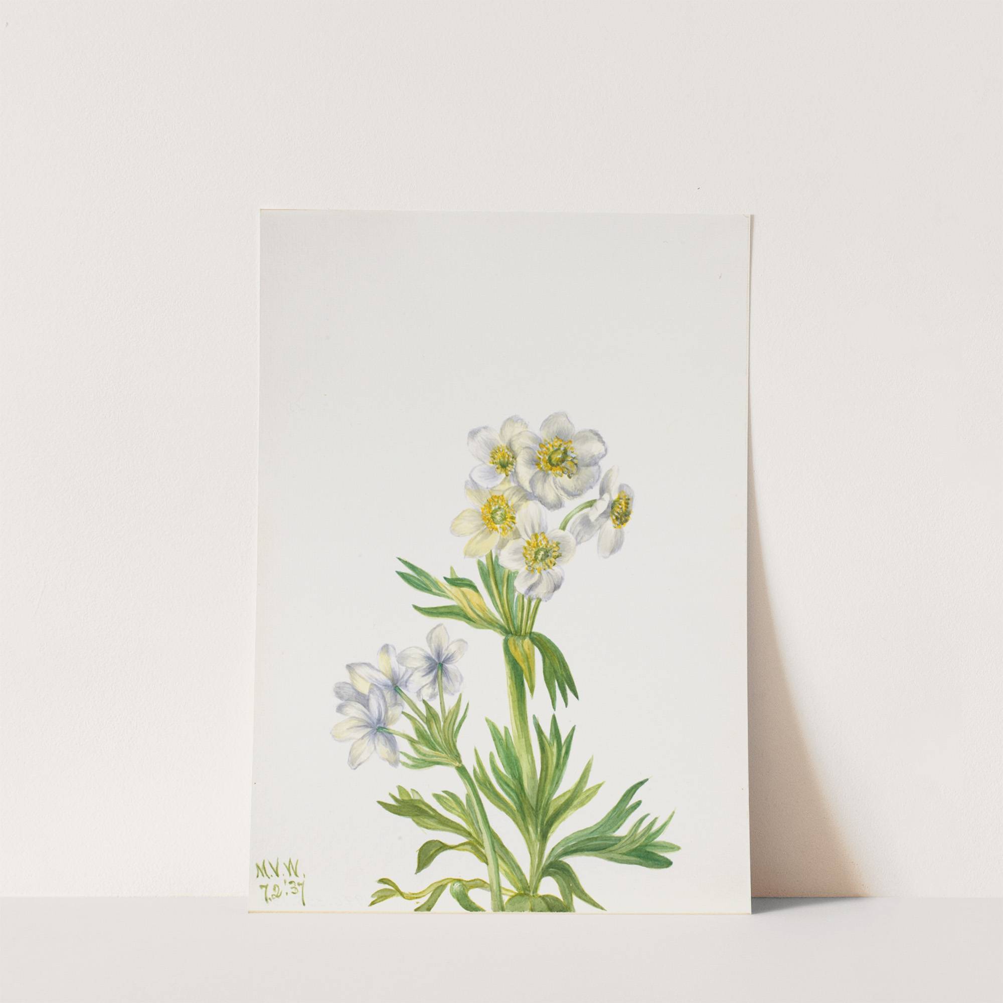 This beautiful art print features "Autumn Leaves" by Mary Vaux Walcott, showcasing delicate flowers in vibrant detail. The illustration captures white flowers with soft yellow centers, standing tall on slender green stems and leaves. Two prominent clusters of flowers dominate...