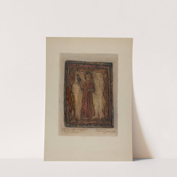 This artwork, titled "Santo" by Maude Valle, features a charming depiction of a child saint in a traditional, stylized manner. The piece is painted with a mix of warm browns, reds, and muted yellows, creating an earthy and nostalgic palette....