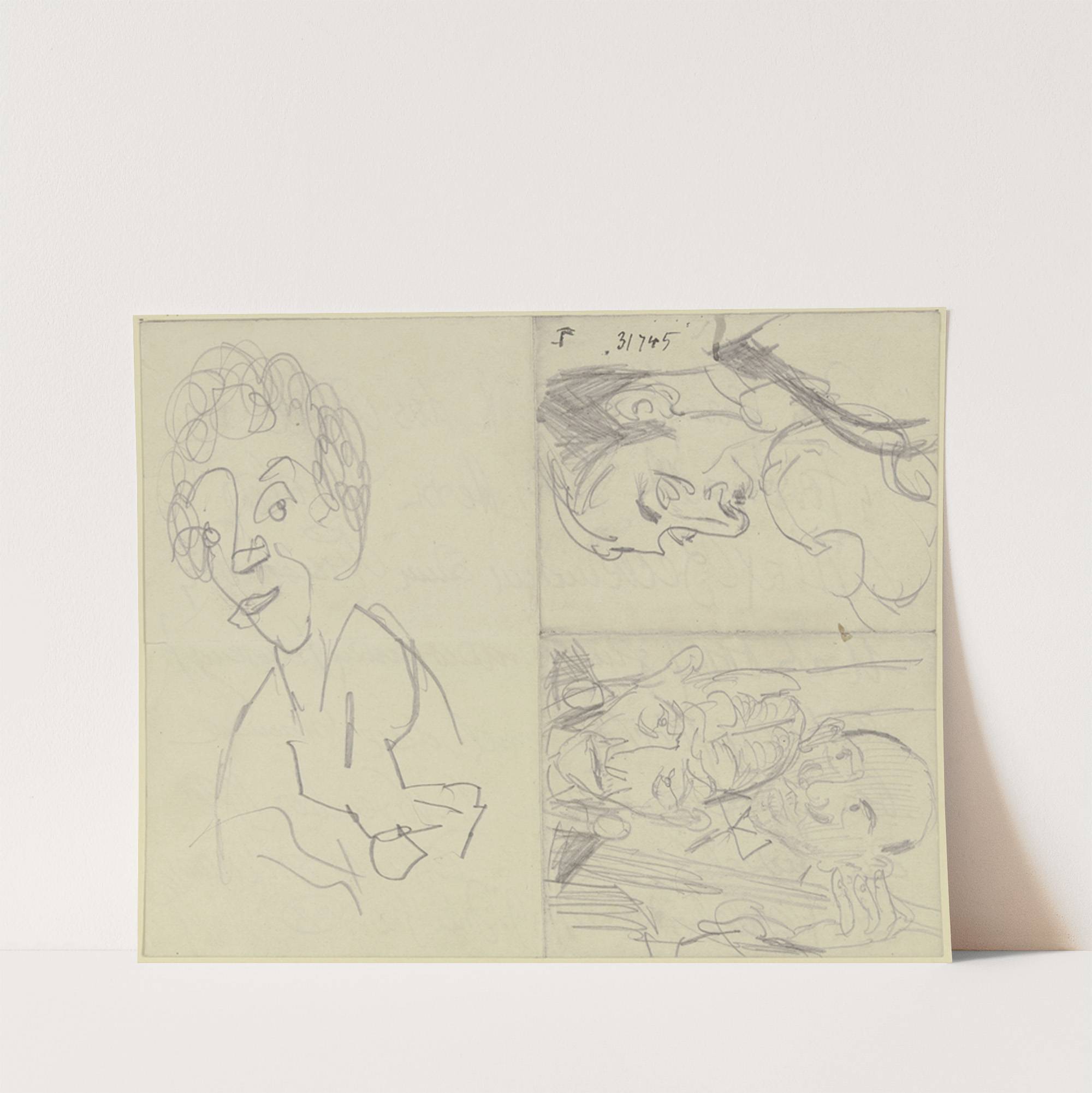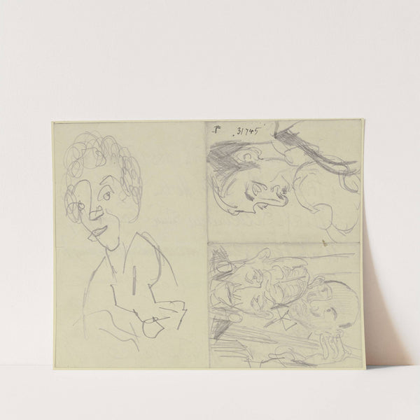 Frauenkopf, ein Geiger, zwei Bassisten (Drei verschiedene Skizzen auf einem durch Faltung in vier Felder unterteilten Papierbogen) by Max Beckmann - Wall Art Print