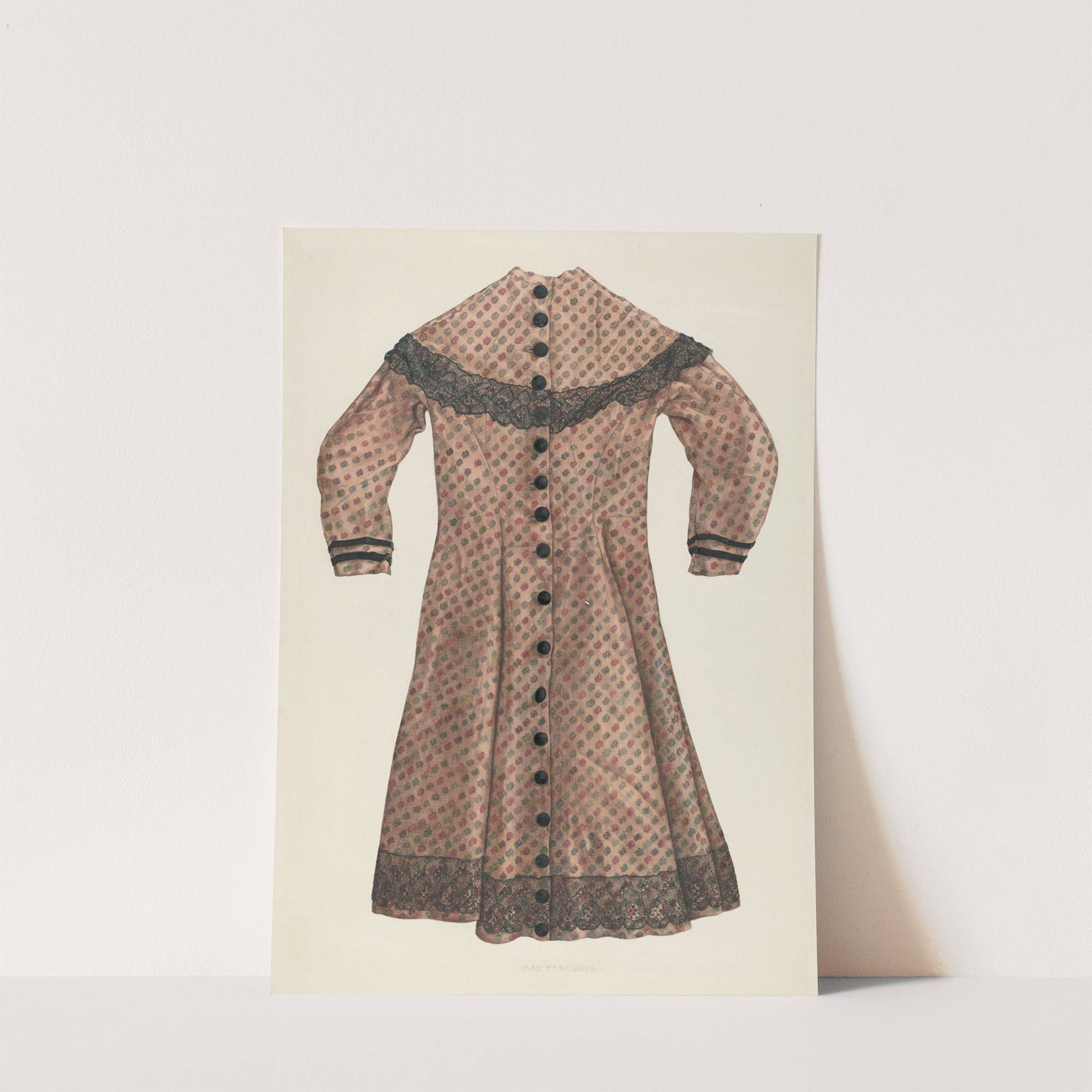 This elegant dress is a timeless piece of fashion artistry by Max Ferneke, titled "Challis Girl's Dress." The garment features a classic design with a delicate pinkish-beige base, adorned with an intricate pattern of small, interlocking red and blue diamond...