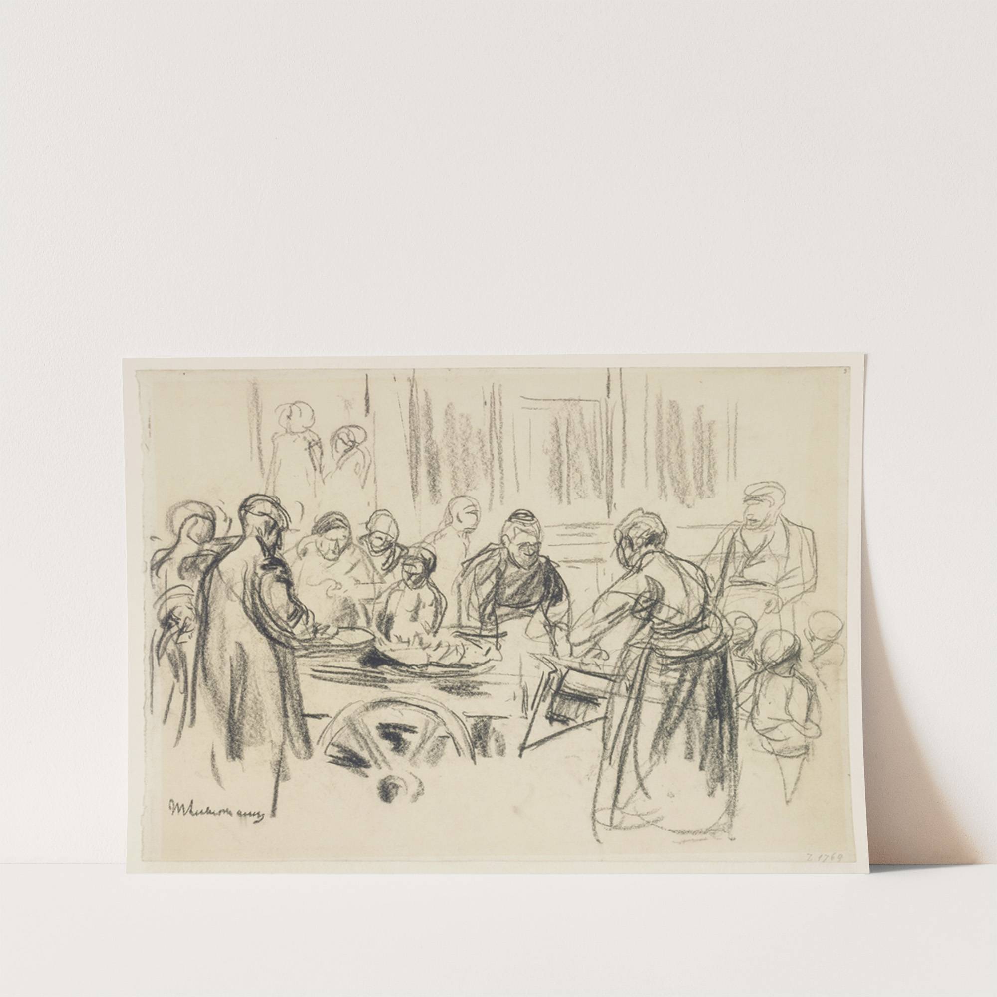 This black-and-white sketch by Max Liebermann captures a lively scene set in a historic European setting. The drawing is characterized by fluid, expressive lines that convey movement and interaction among the figures. In the center, several people gather around a...