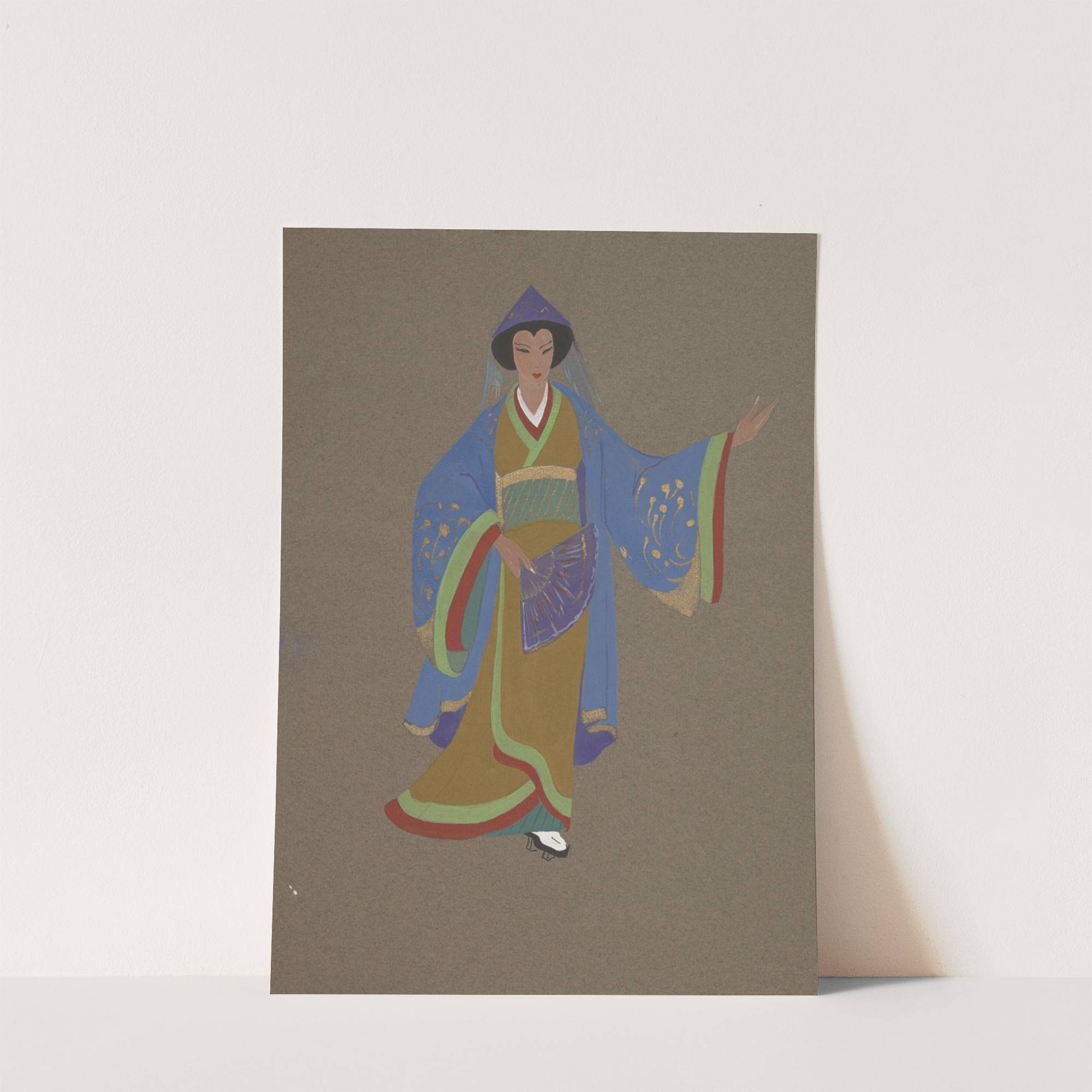 The Mikado: Orange kimono with green and red edges tied with a green striped obi (1934-1943) by Maxine Borowsky - Wall Art Print