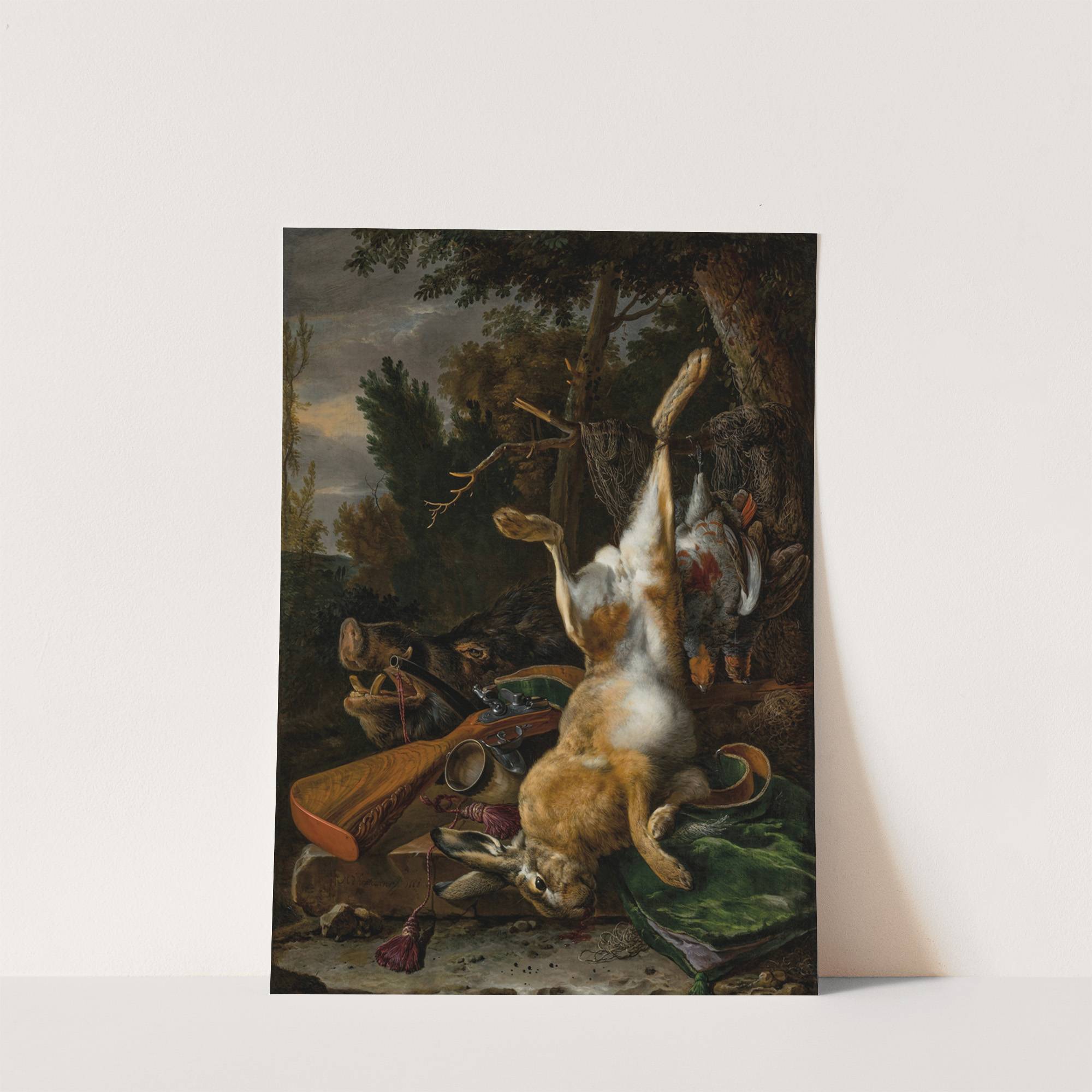 A game still life with a hung hare, a boar’s head and a musket in a landscape (1668)