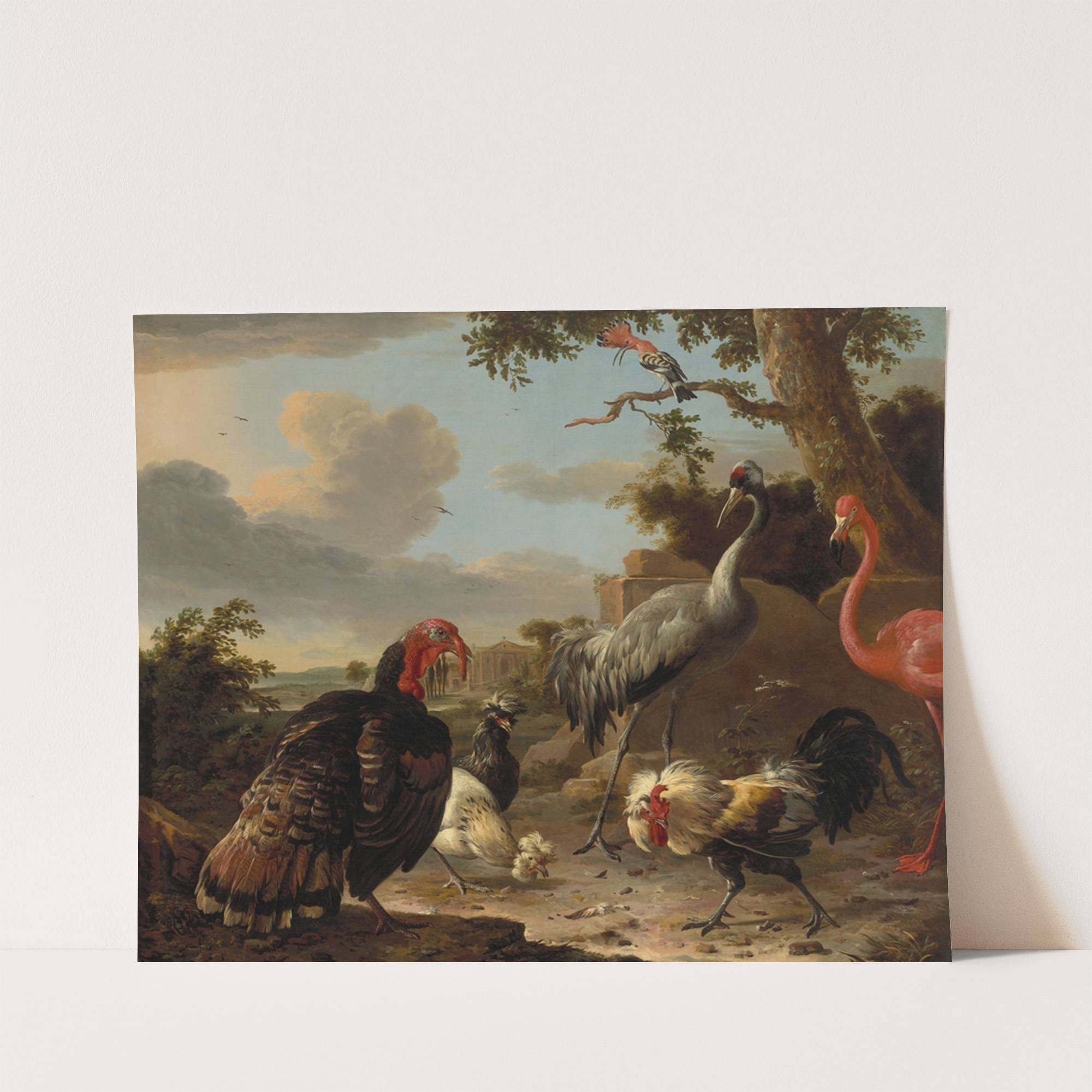 A sarus crane, a flamingo, a wild bronze turkey cock, two Paduan fowl, a silver birchen game cockerel, and a hoopoe in a landscape (1675) by Melchior d'Hondecoeter