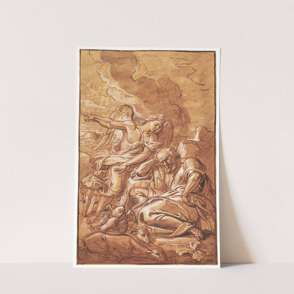 En engel kommer til en sovende eller grublende mand, der omgivet af får, kvæg og duer, sidder i et øde landskab Englen vækker Elias i ørkenen by Michel Corneille the Elder - Wall Art Print
