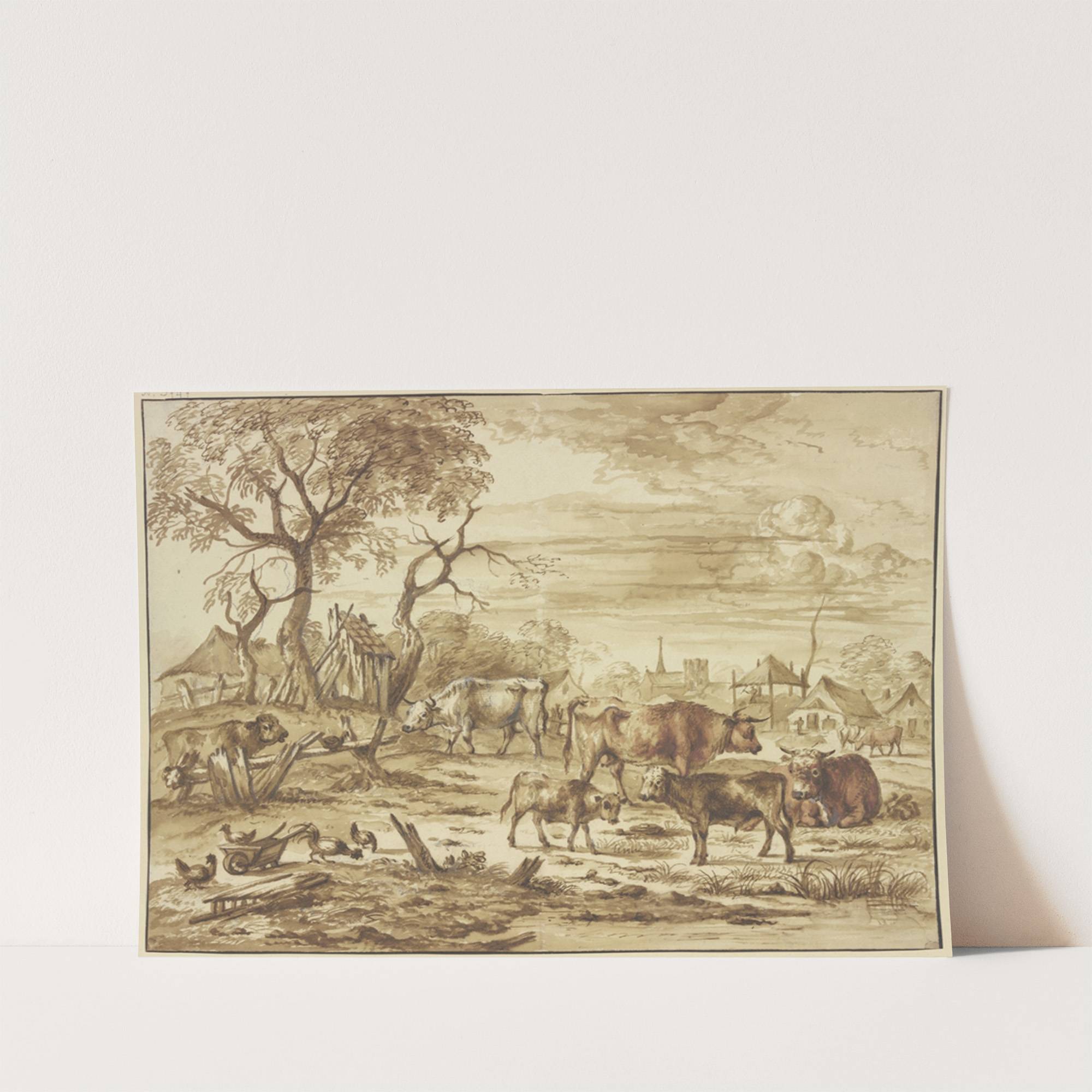 Bei einem Dorf Kühe und Kälber, links bei einem Schubkarren Hühner by Michiel Carree - Wall Art Print