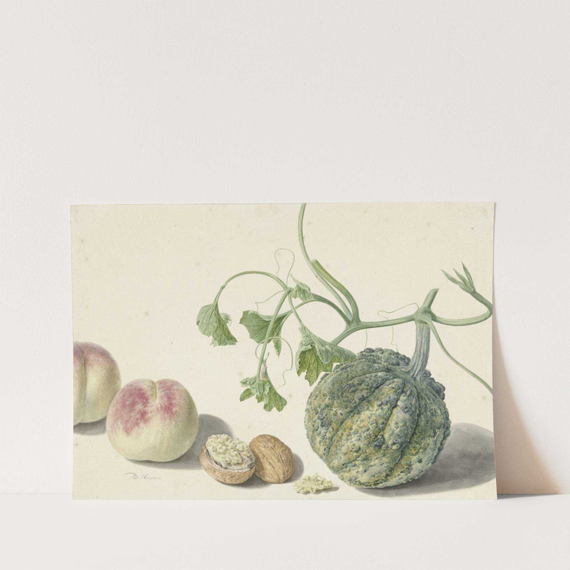 Kalebas, twee perziken en een walnoot by Michiel van Huysum - Wall Art Print