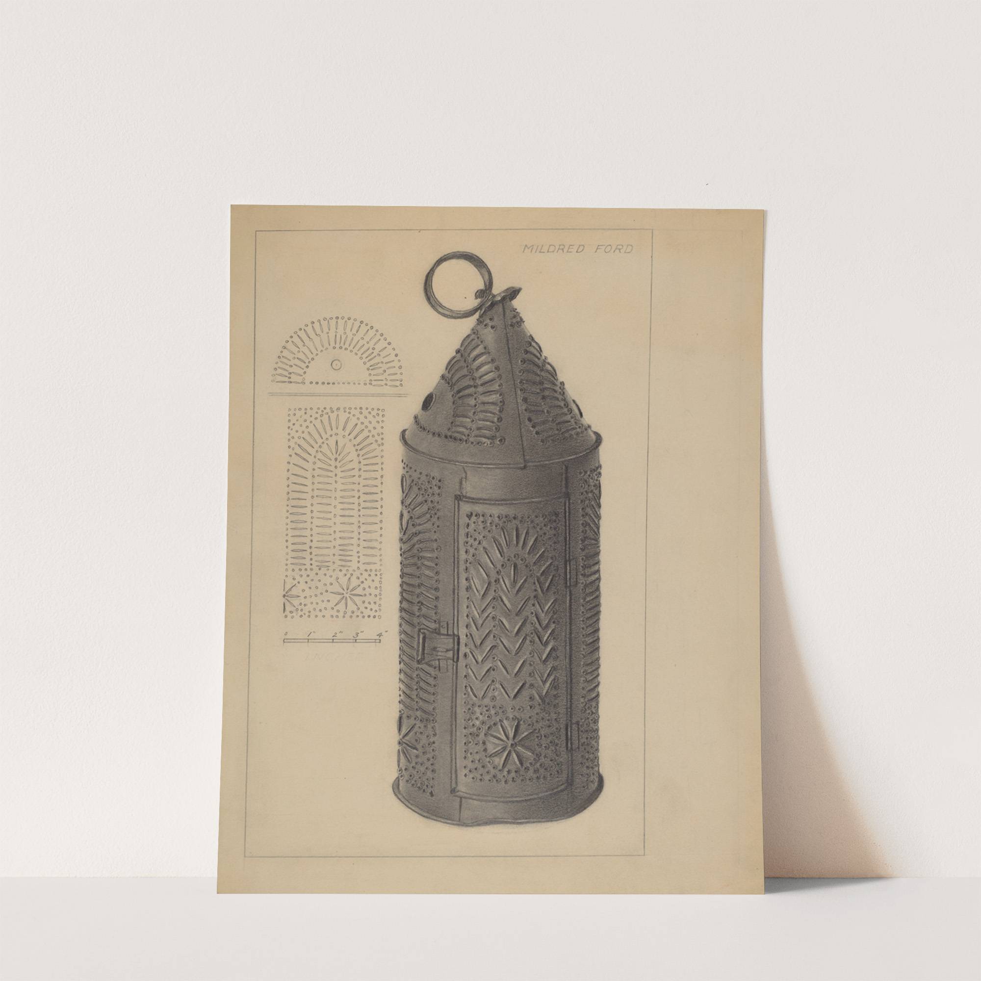 Introducing "Lantern" by Mildred Ford – a beautifully detailed illustration of an intricately designed metal lantern. This exquisite piece showcases a cylindrical shape with a conical top crowned by a simple metal ring handle, perfect for hanging. The lantern is...
