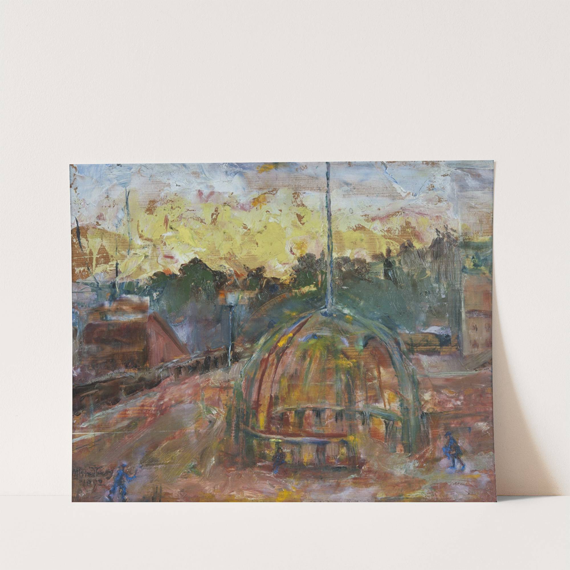 Experience the enchanting beauty of "Sunrise in S?dert?lje" by Mina Carlson-Bredberg. This vibrant oil painting on canvas captures the serene yet dynamic atmosphere of early morning light. Central to the composition is a tall, dome-shaped birdcage standing prominently in the...
