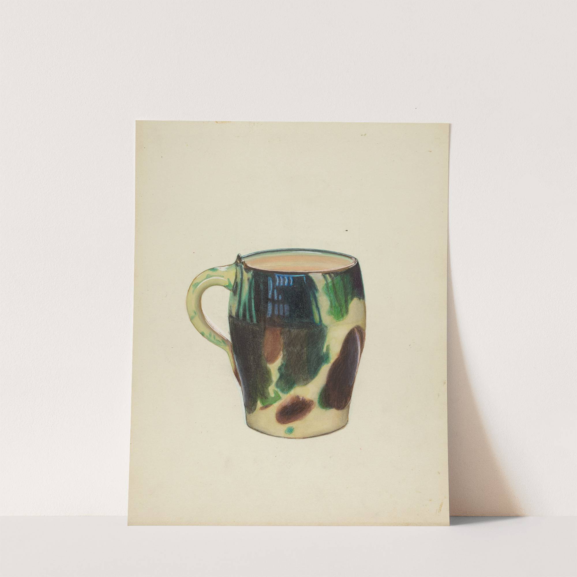 This art print features "Large Mug" by Mina Lowry, showcasing a beautifully abstract ceramic mug in vivid colors. The mug is depicted in a rich, glossy finish with dynamic patterns of dark green, brown, and black swirls against a creamy...