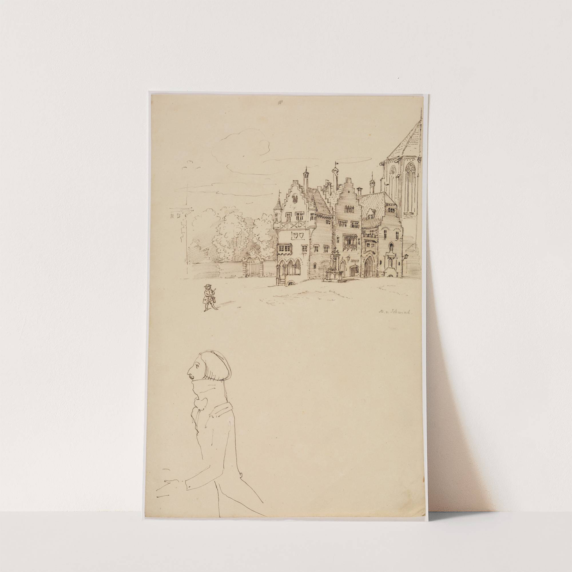 Drei gotische Häuser zwischen barockem Gartentor und gotischem Kirchenchor, darunter Skizze eines schreitenden Mannes by Moritz von Schwind - Wall Art Print