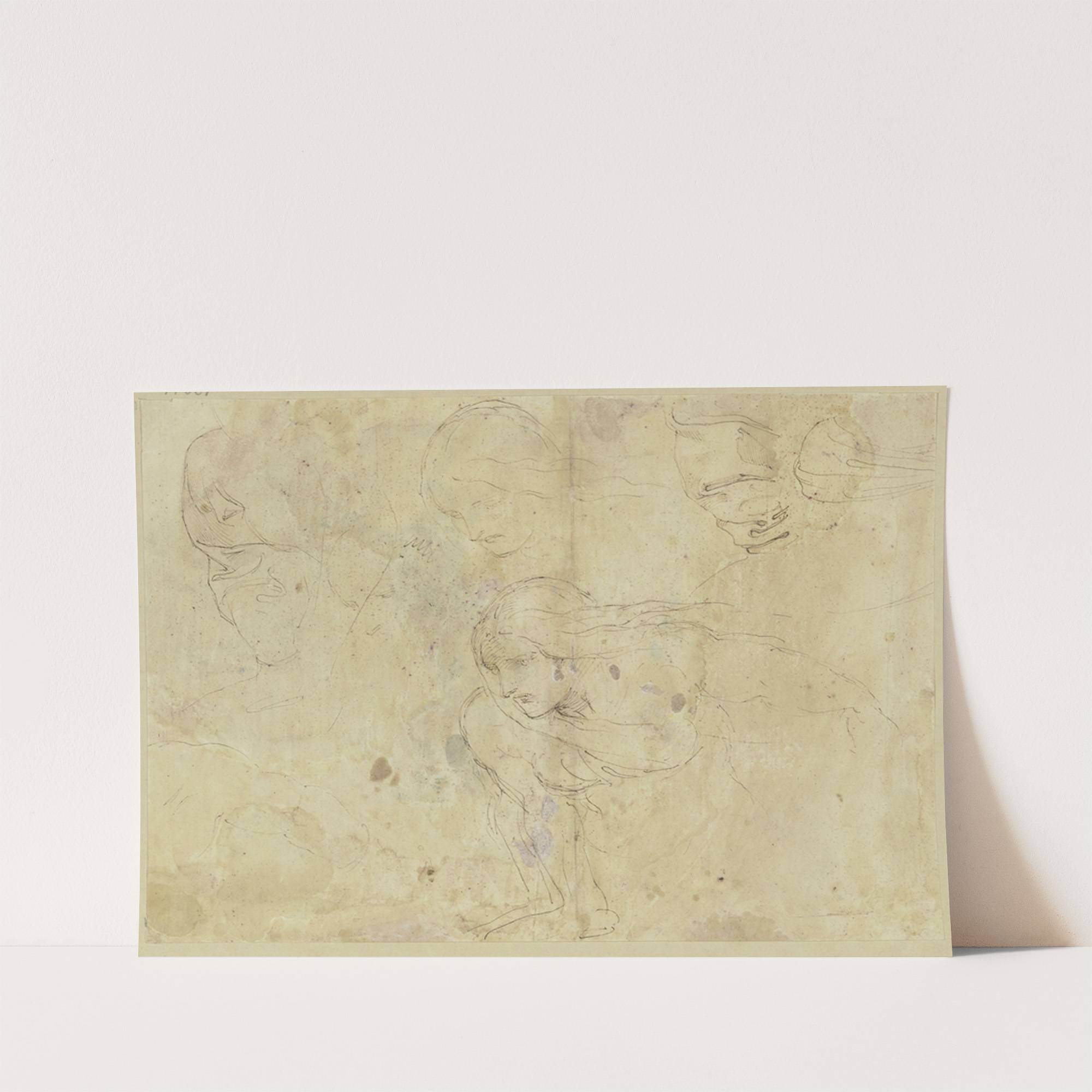 Oberkörper einer sich vorbeugenden Frau, Wiederholung ihres Kopfes und Gewandstudien by Moritz von Schwind - Wall Art Print