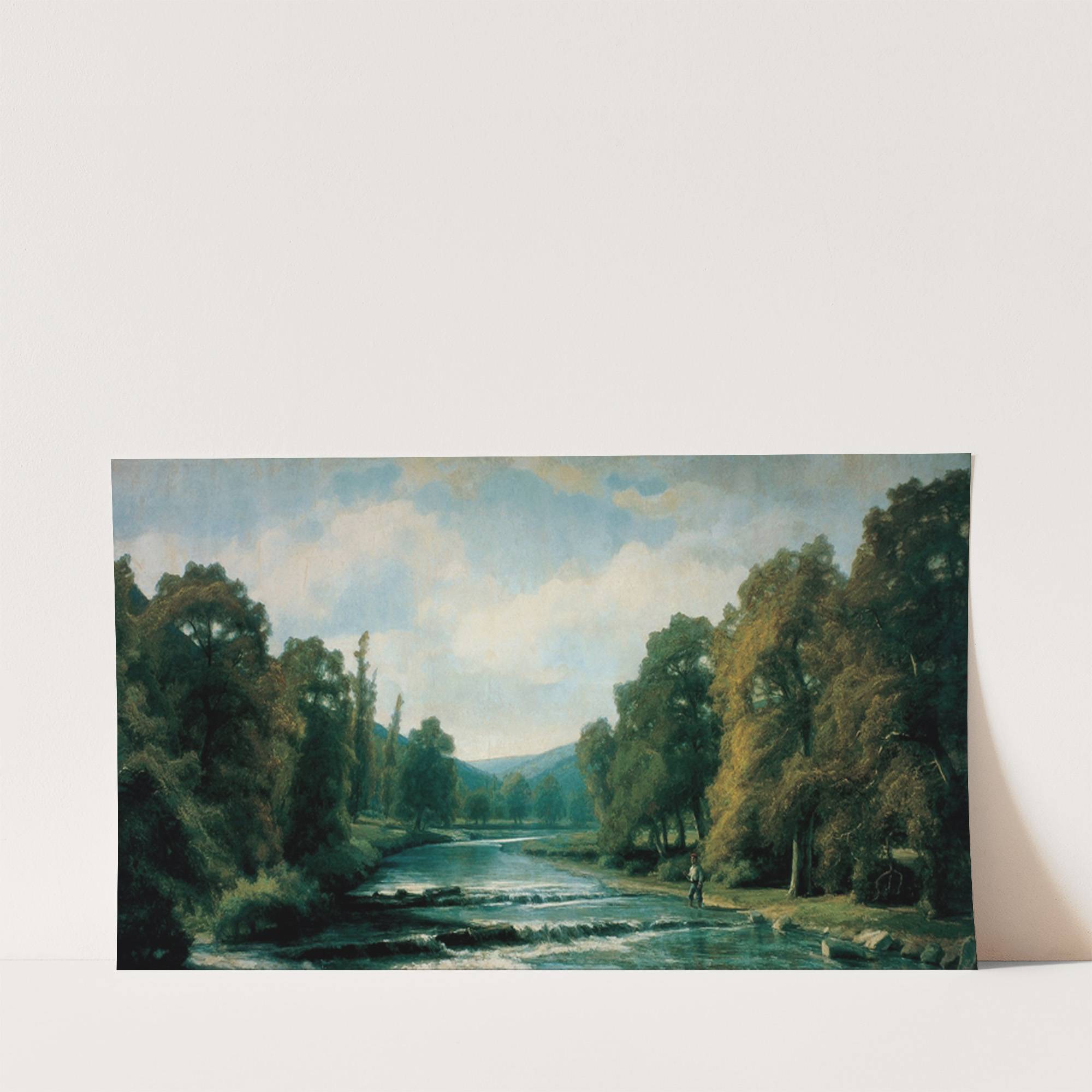 This stunning landscape print is titled "Mountain Landscape" by Agustín de Riancho. The artwork features a tranquil river flowing gently through a lush forest, with towering trees lining both banks of the waterway. The artist's use of color creates a...
