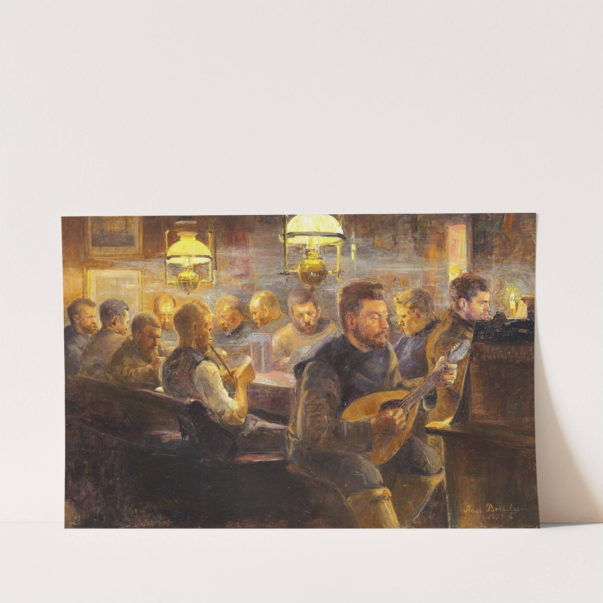 This captivating art print titled "Aftensang" by Aage Bertelsen captures the warm, nostalgic ambiance of an evening music session in a cozy bar setting. The scene is rich with golden hues and soft light emanating from two vintage wall-mounted lamps...