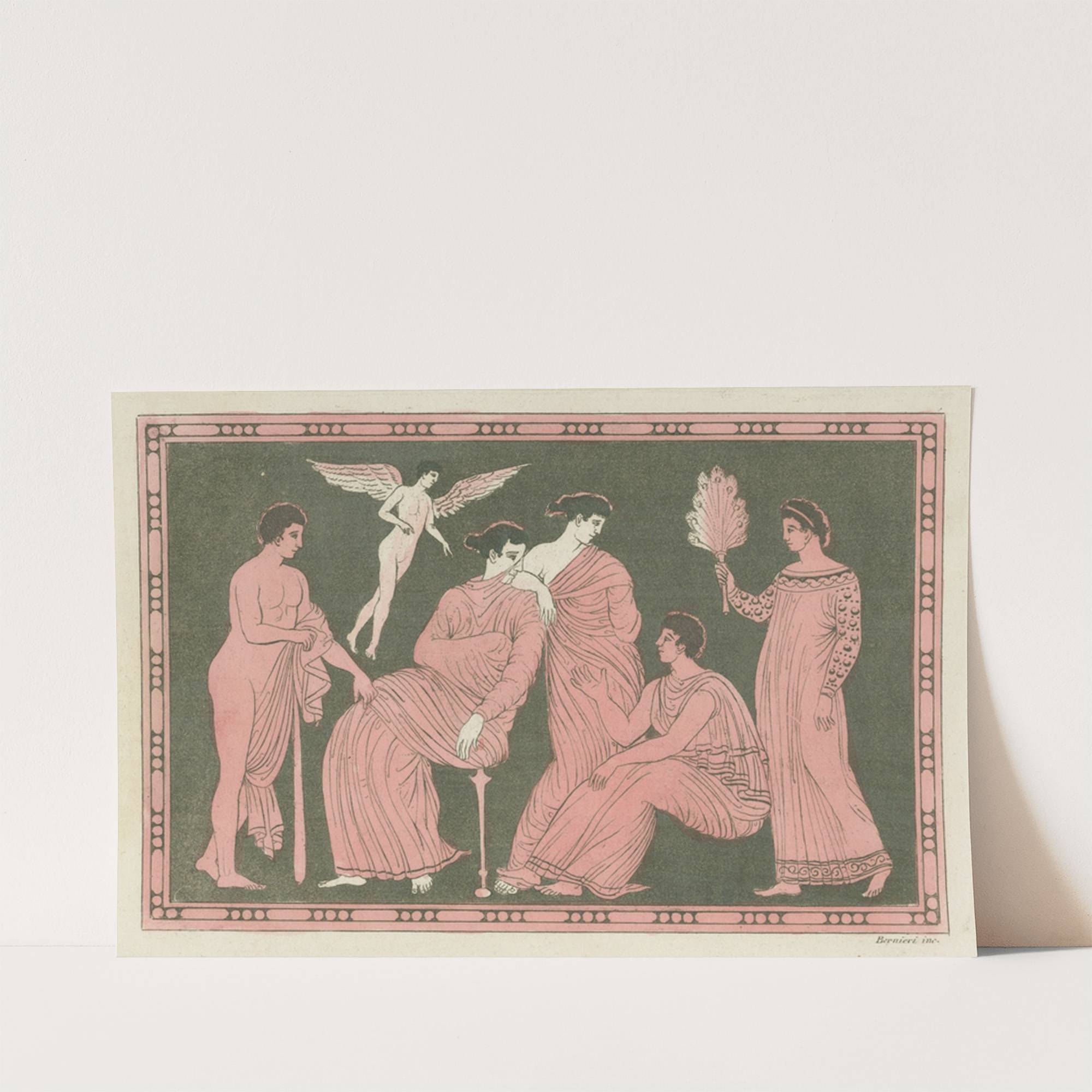 This print showcases "Ercole e Onfale" by Andrea Bernieri, an exquisite example of classical art from the early 19th century. The scene is richly detailed with soft, pastel pink and green hues, creating a gentle, almost ethereal atmosphere. Five figures...