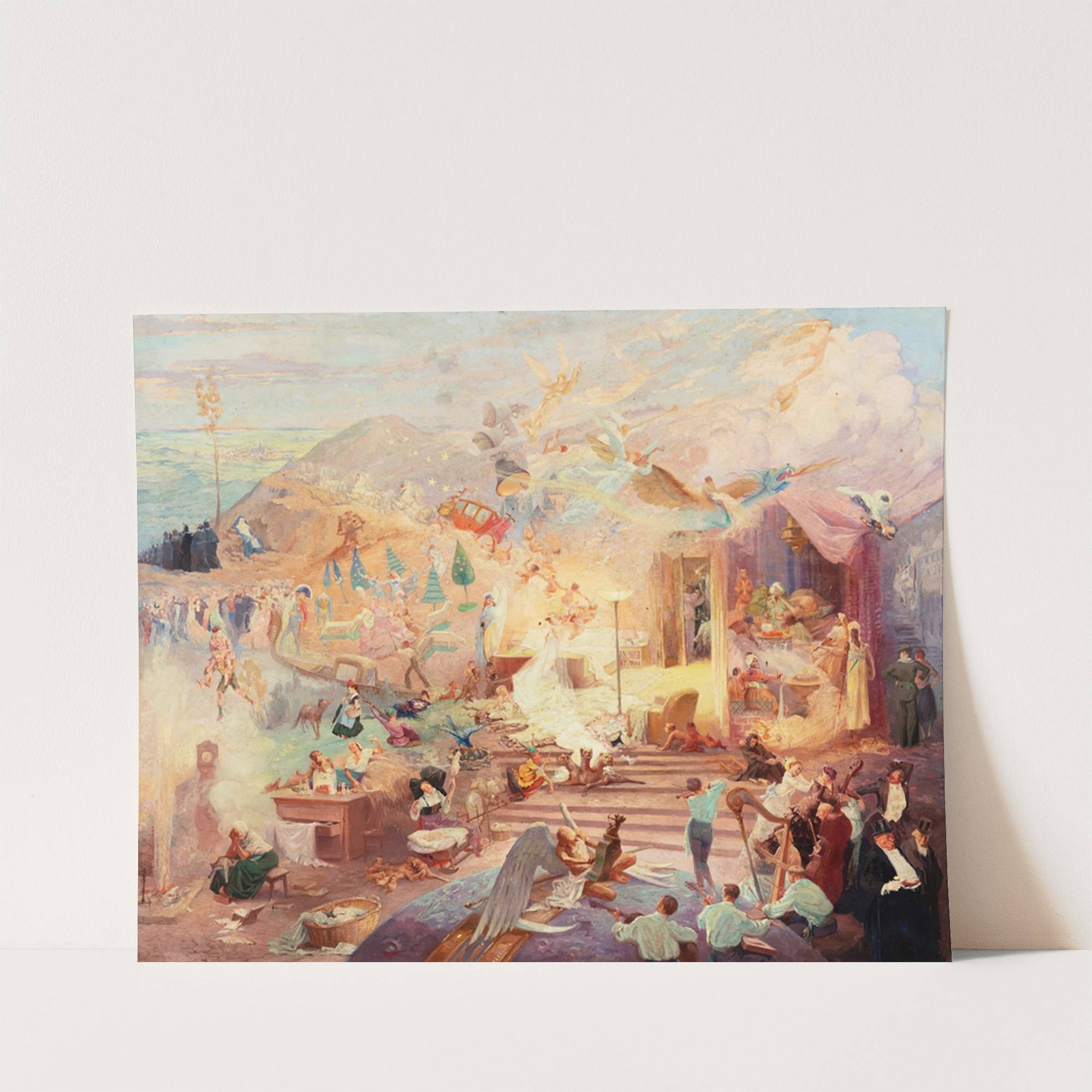 This vibrant print captures "Phantasmagorical Scene, also called Liberty" by Adolphe Léon Willette. The artwork bursts with energy and color, depicting a bustling outdoor market filled with activity. Sunlight bathes the scene in warm hues of orange and pink, creating...