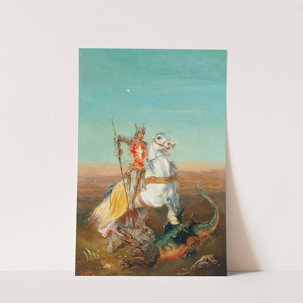 This vibrant artwork titled "St George And The Dragon" by Alexander Von Bensa showcases a dramatic medieval battle scene in rich, bold colors. At the center of the painting is Saint George, clad in gleaming silver armor with intricate gold...