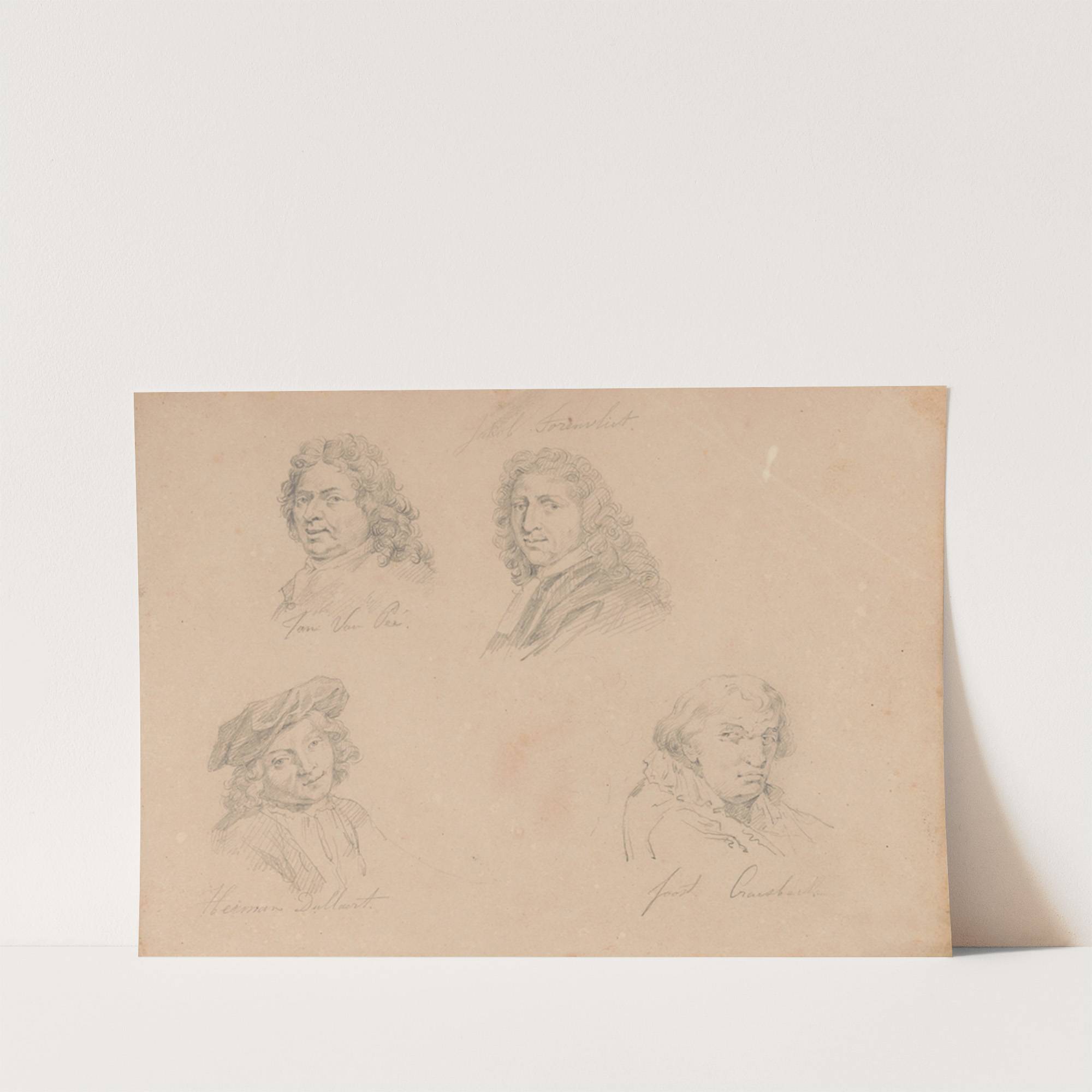 This art print showcases four delicate pencil sketches of male portraits by the renowned artist Nicaise De Keyser. Each portrait captures a unique character with subtle yet expressive details. The top left portrait features a man with wavy, shoulder-length hair...