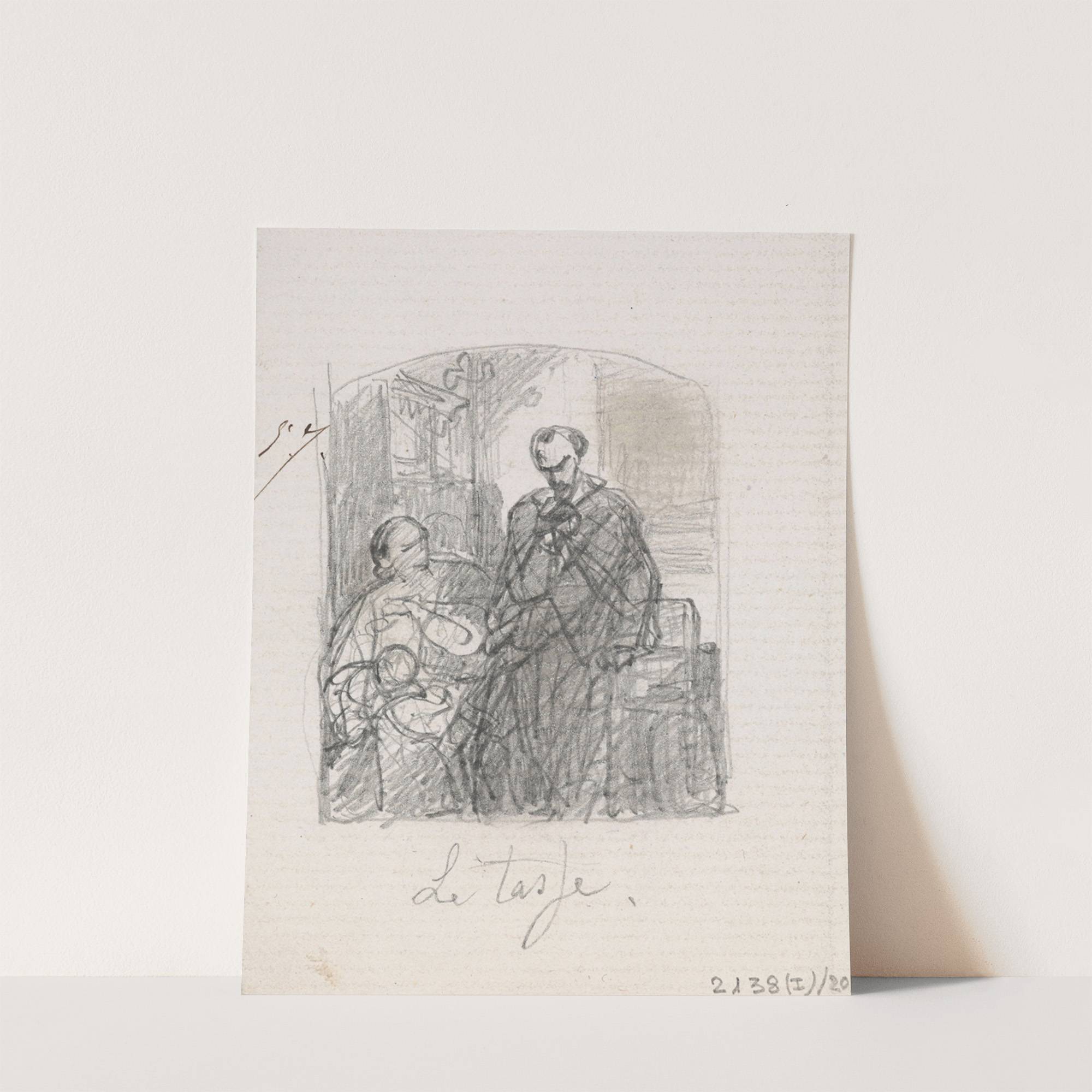 This art print features a delicate pencil drawing by Nicaise De Keyser titled "Dressed as a Shepherd, Visits his Sister Cornelia in Sorrento." The piece captures an intimate moment between two figures within a softly sketched interior. On the left,...