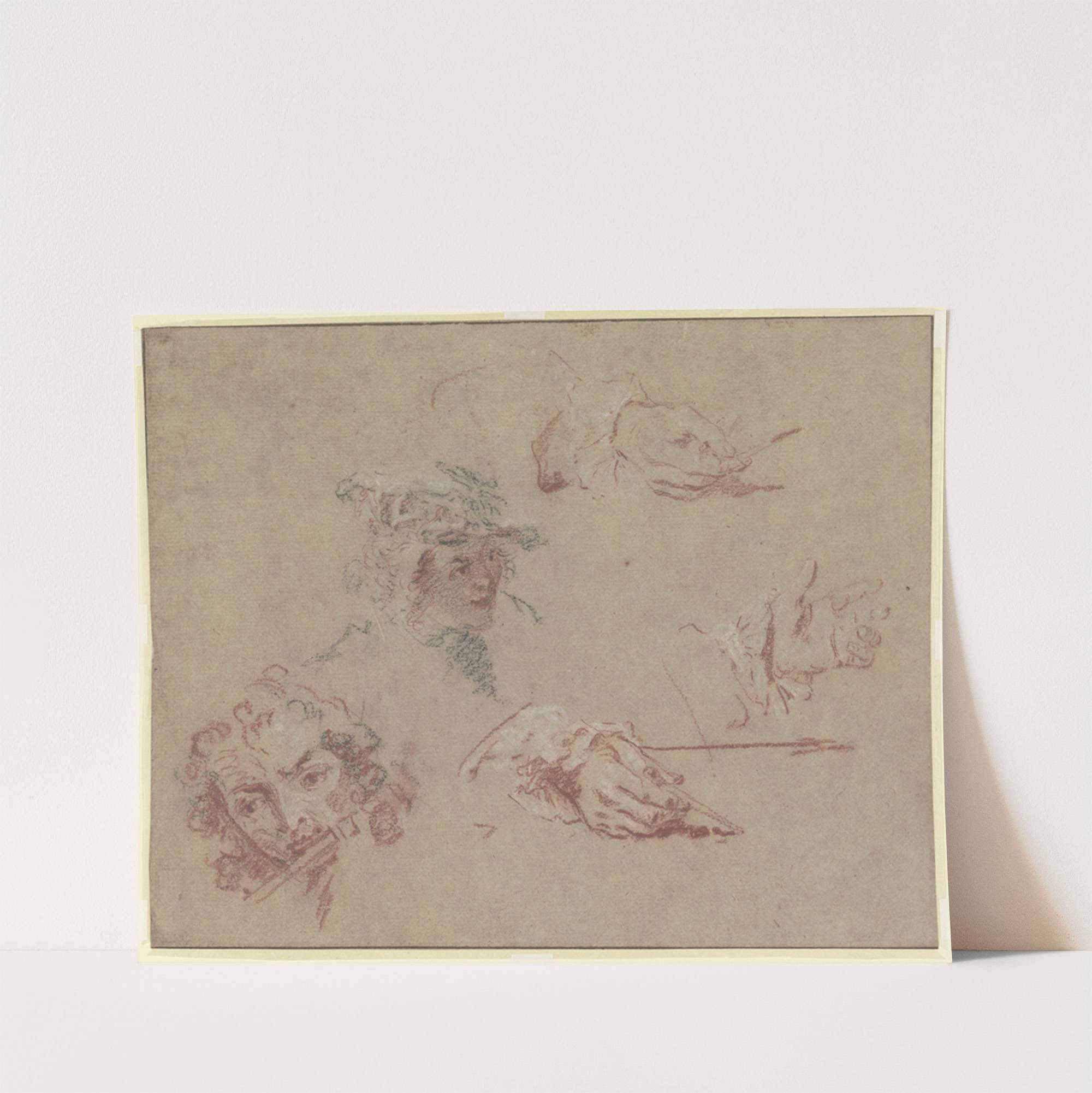 Kopf eines Flötisten, Kopf eines jungen Mannes mit flachem Barett, drei Hände, zwei Zeichenstift und Zirkel haltend by Nicolas Lancret - Wall Art Print