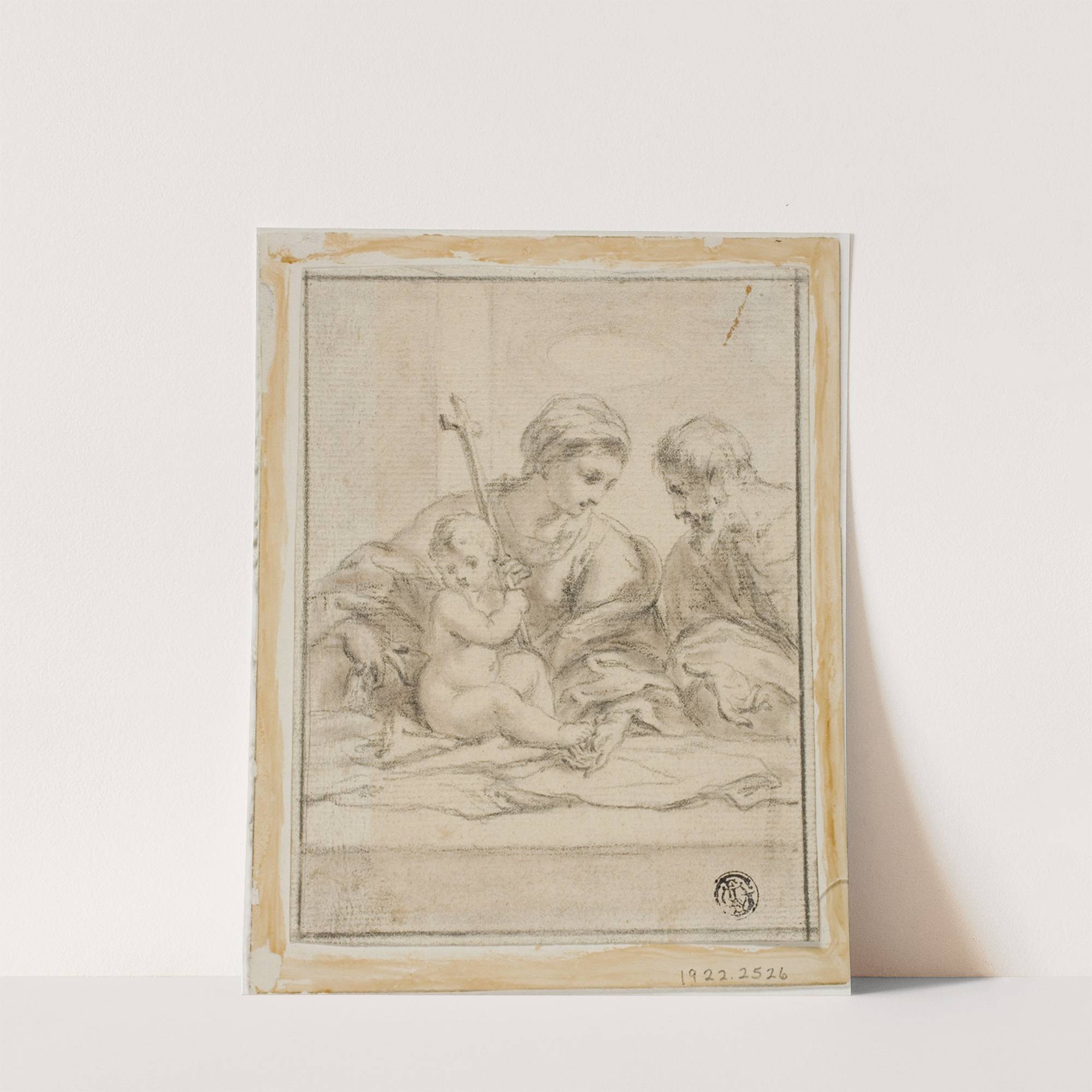 This art print features "Holy Family" by After Bartolommeo Schedoni, rendered in delicate pencil strokes on textured paper. The image captures a tender biblical scene where the Virgin Mary, wrapped in a modest cloth, sits with baby Jesus and an...