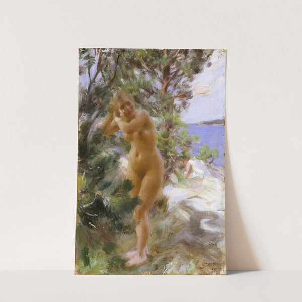 This art print features "After the Bath" by Anders Zorn, capturing a serene and naturalistic scene in impressionist style. The composition centers on a nude woman standing among lush green foliage and tree branches. Her skin is a warm, golden...