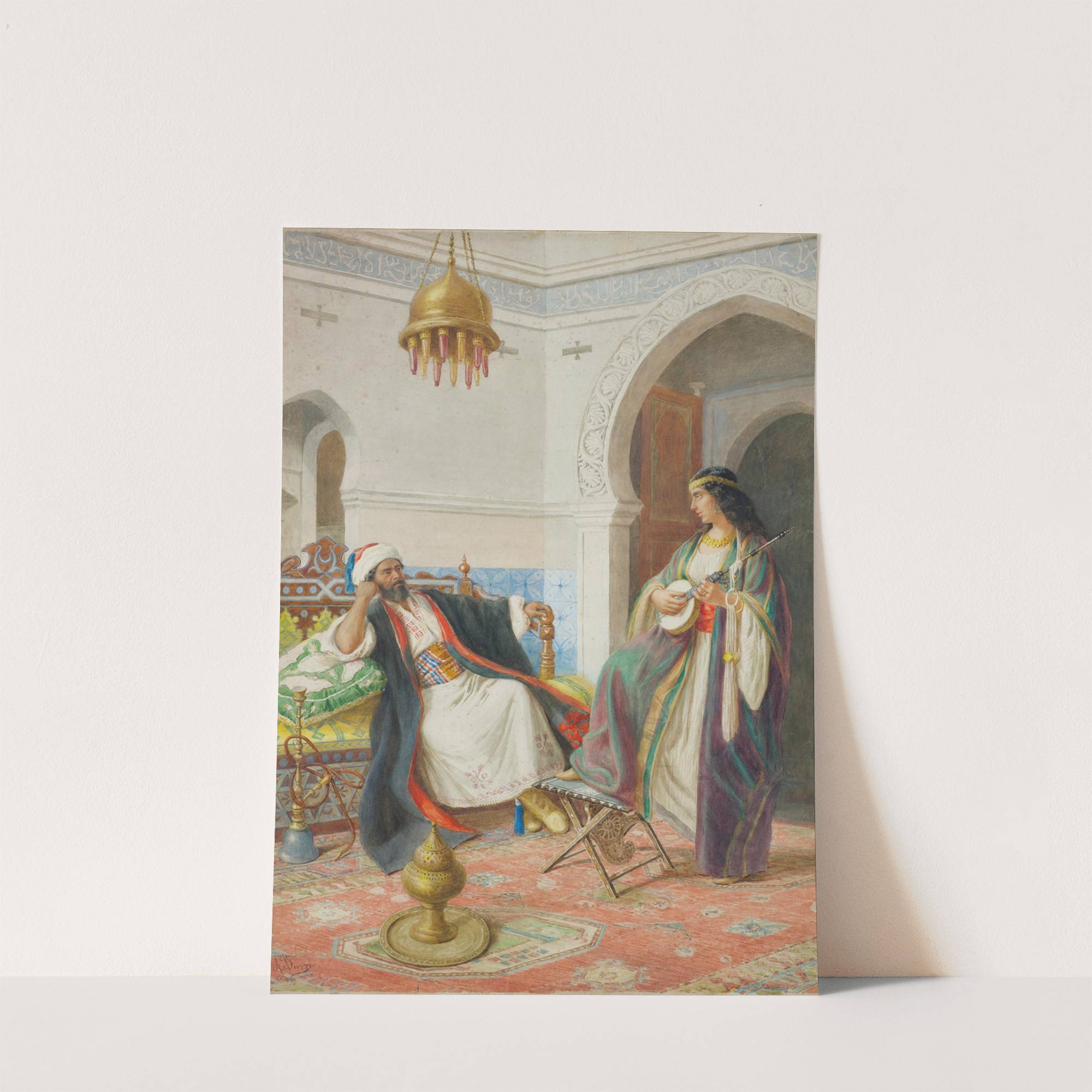 This exquisite art print features "In the Harem" by the renowned artist Achille Buzzi. This vivid painting depicts two figures within an opulent harem setting. On the left, a bearded man with tanned skin reclines comfortably on a luxurious chaise...