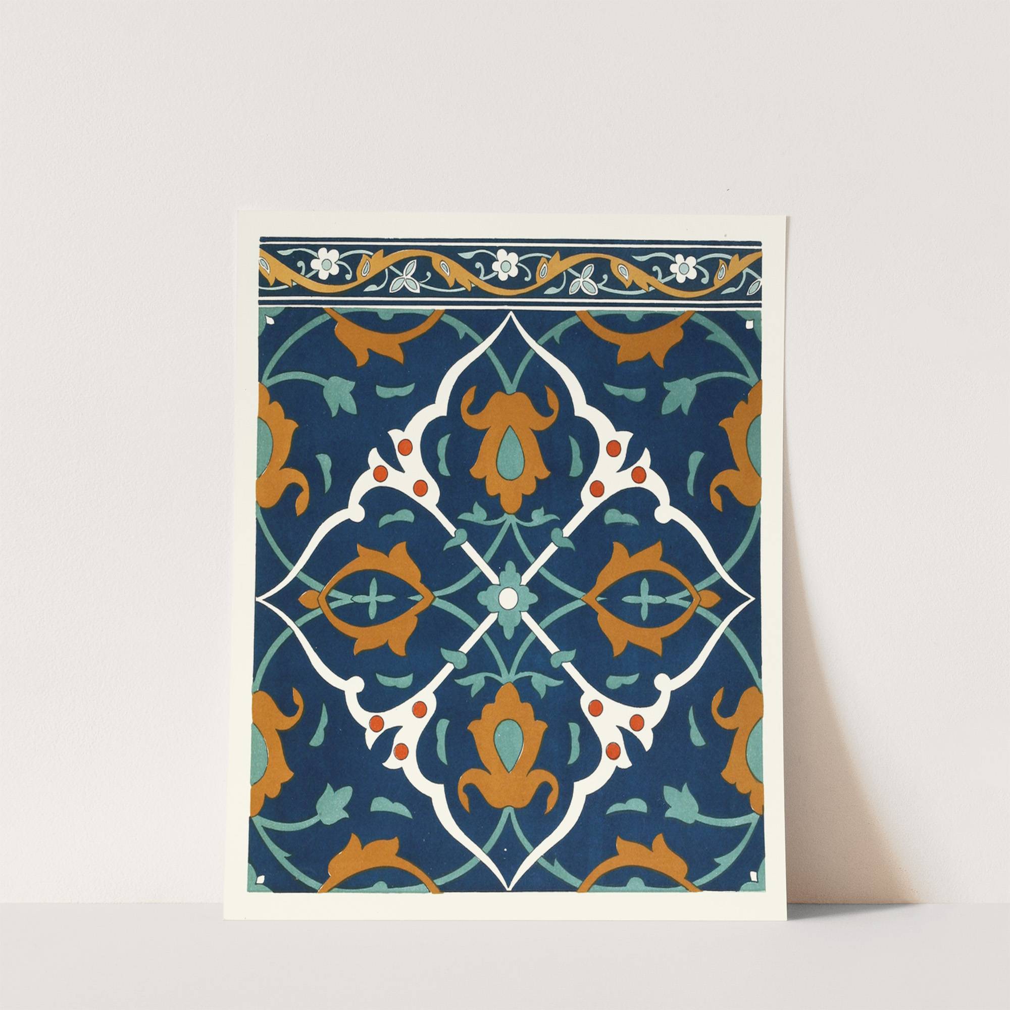This vibrant art print features "18 Plates of Ornamental Tiles" by the Afghan Boundary Commission, showcasing an intricate geometric pattern that exudes cultural elegance and modern design charm. The central starburst is composed of bold red and black triangular segments...