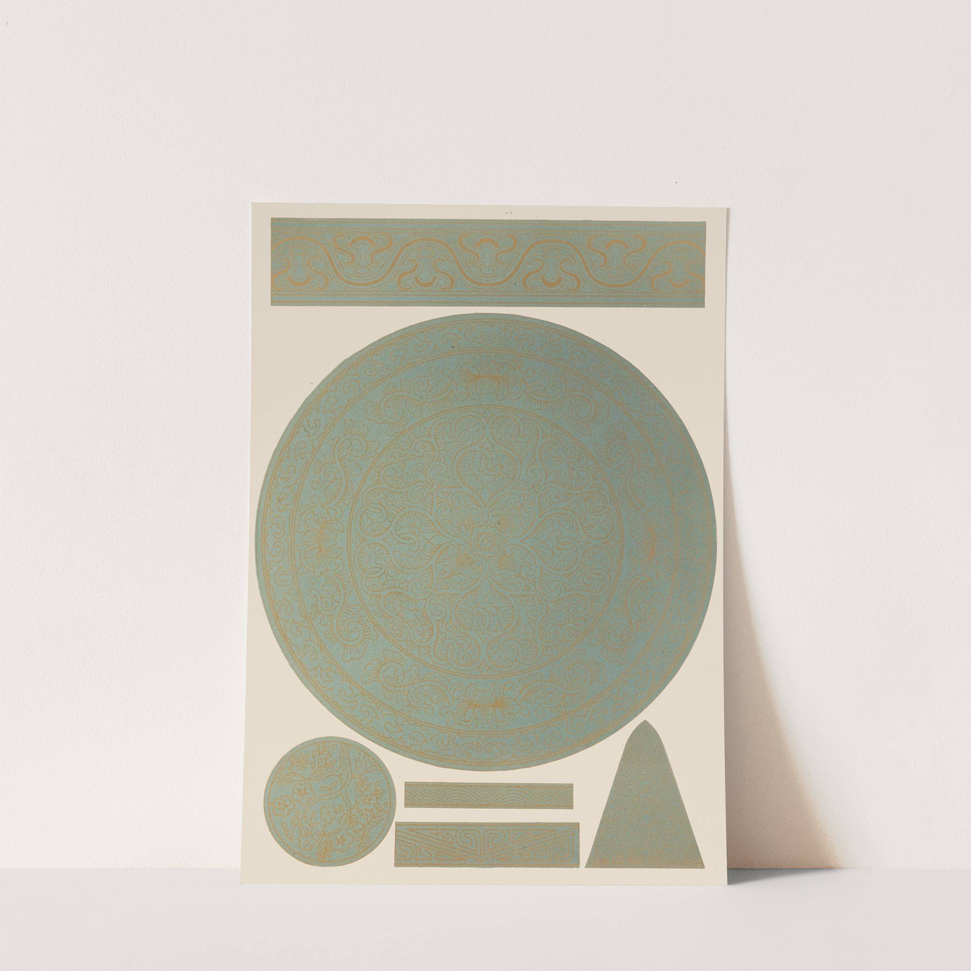 Introducing "Examples of Chinese Ornament," a stunning digital artwork by renowned artist Owen Jones. This piece features a beautiful array of decorative patterns inspired by traditional Chinese motifs, presented in an elegant palette of light teal and golden yellow hues.At...