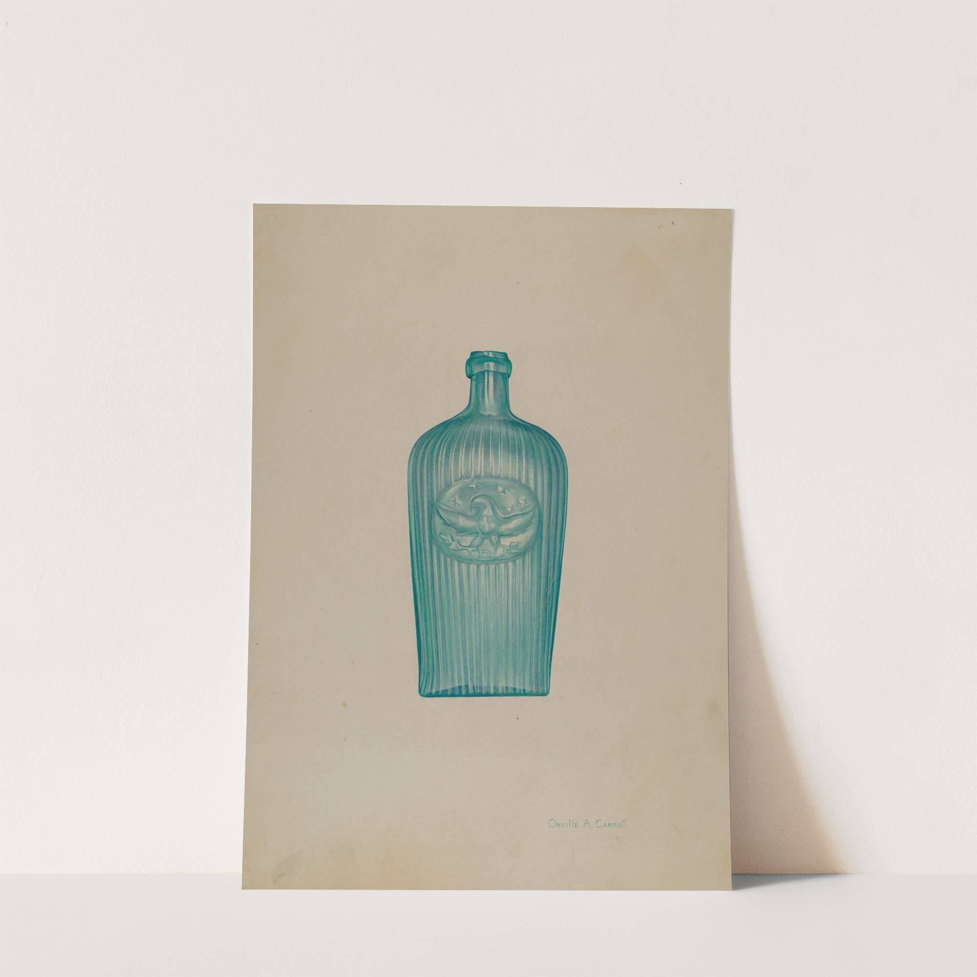 This art print features "Glass Bottle" by Orville A. Carroll, rendered in a meticulous, realistic style that highlights the elegant simplicity of classic glassware. The bottle is depicted in a vibrant, translucent blue-green hue, showcasing its delicate and vertical ridges...
