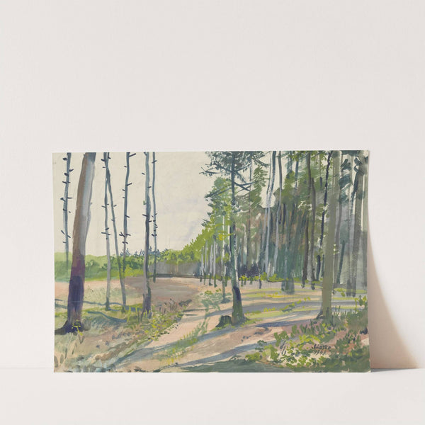 This artwork titled "Kallham (1948)" by Oskar Laske is a captivating watercolor painting of a serene forest pathway. The scene captures the dappled sunlight filtering through tall, slender trees with bare trunks and sparse green foliage, creating a play of...