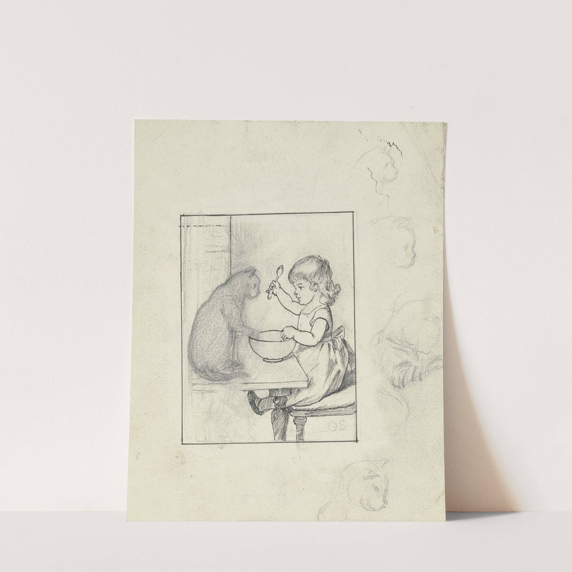 Kind am Esstisch mit Katze, rechts vier Skizzen eines Katzenkopfes im Profil by Otto Scholderer - Wall Art Print