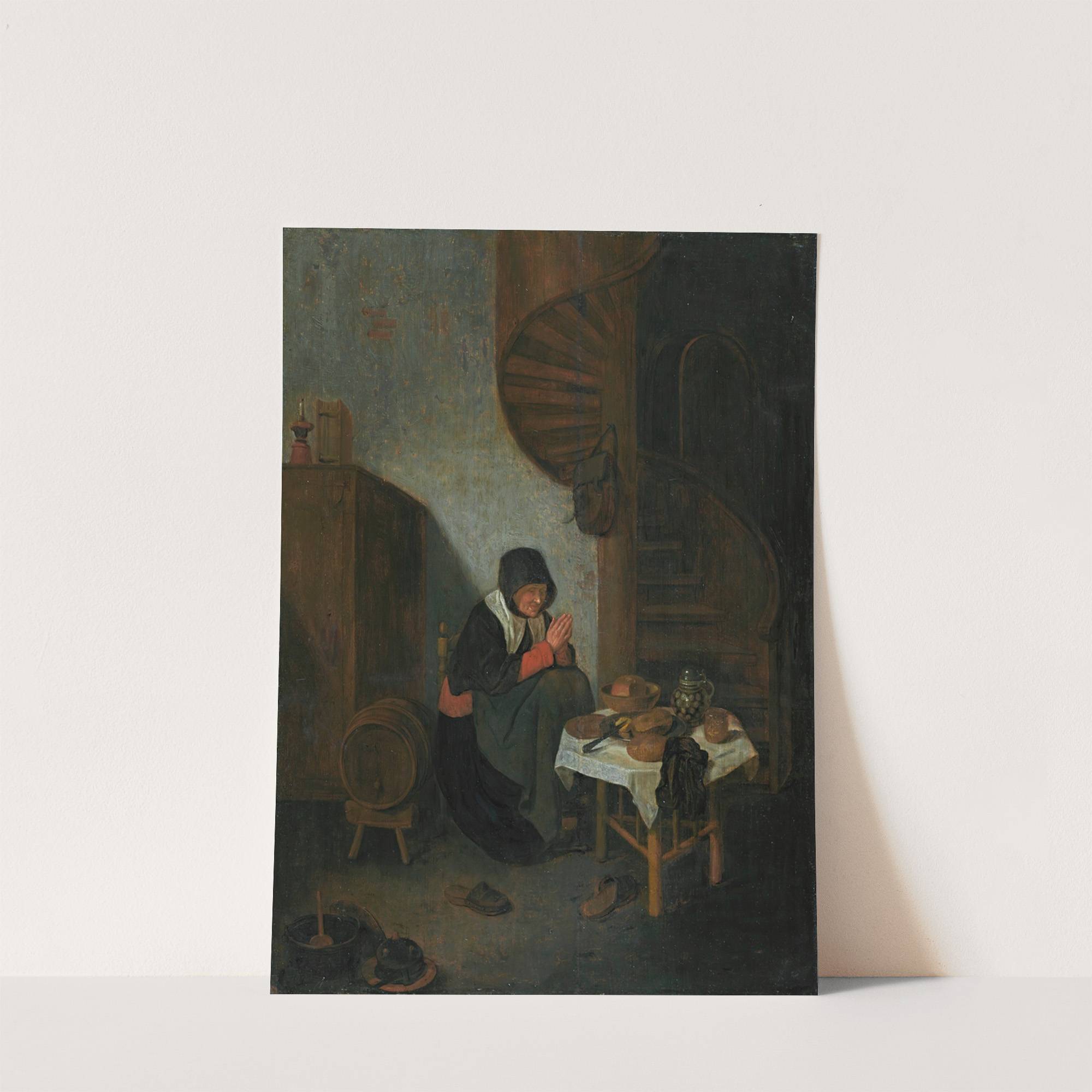 An old woman in an interior saying grace before a meal by Quirijn Van Brekelenkam - Wall Art Print