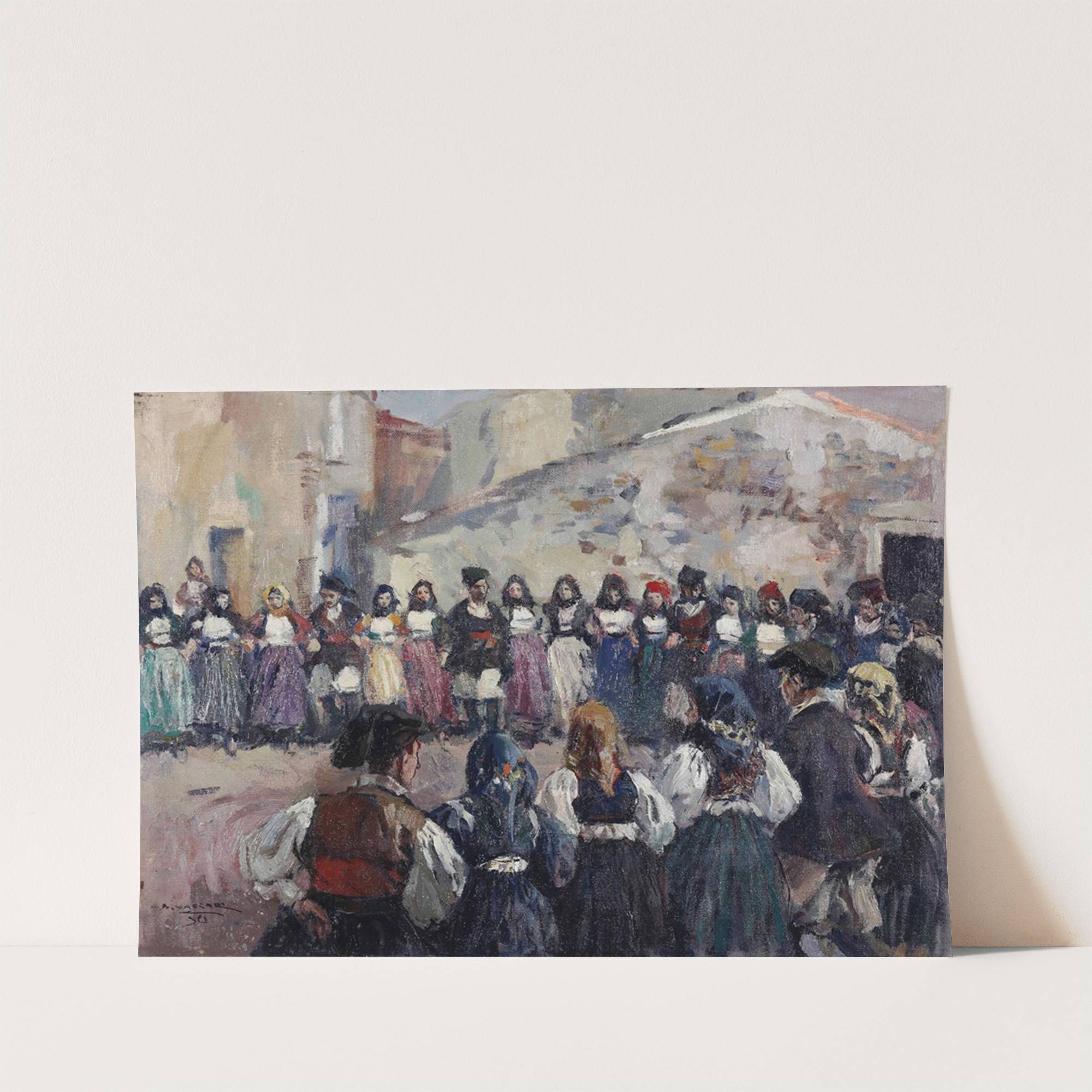 This vibrant painting captures a lively street scene with a group of women standing in a row, dressed in traditional Sardinian attire. The women are adorned in colorful dresses with white aprons, black headscarves, and red hats, creating a striking...
