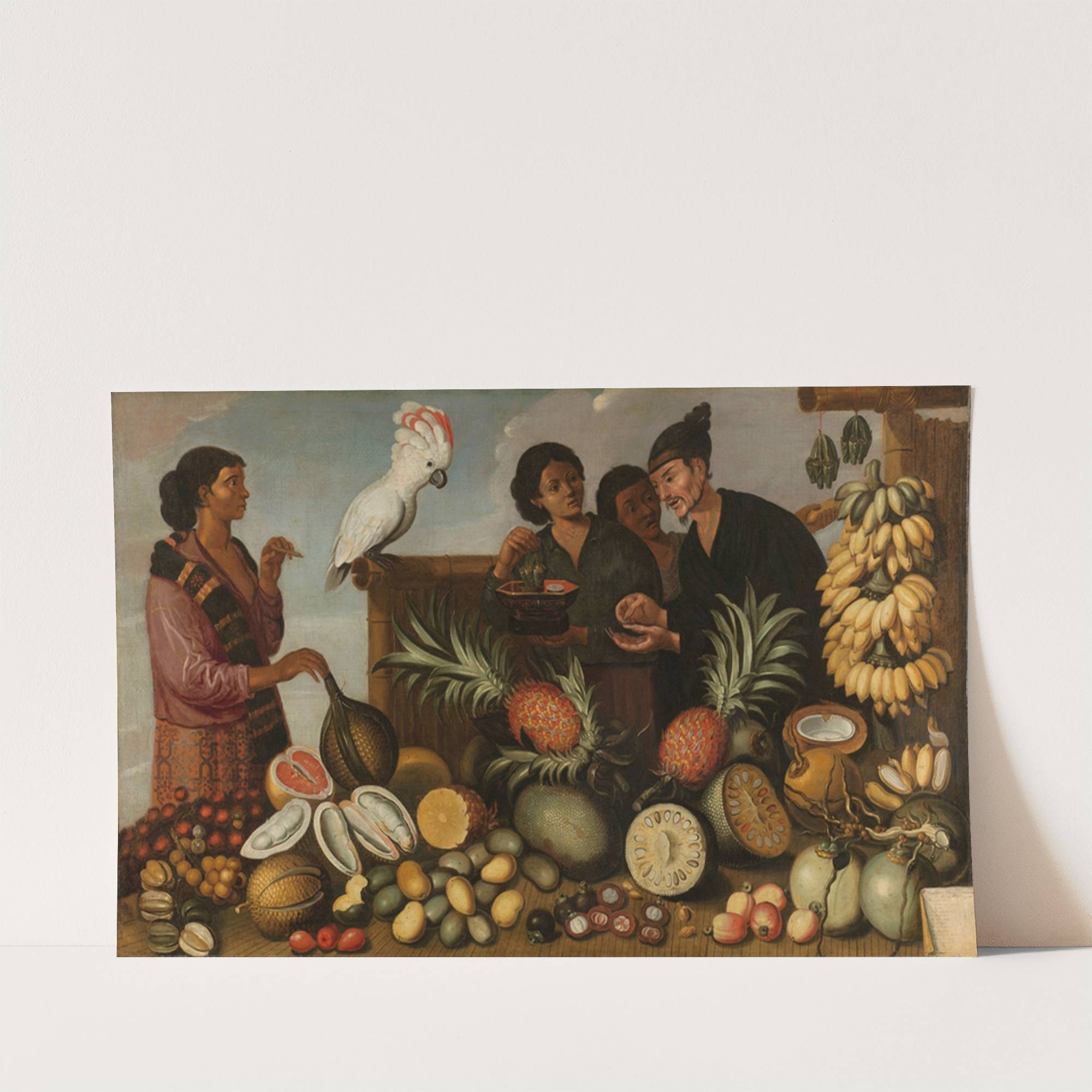 This vibrant artwork titled "East Indian Market Stall in Batavia" by Albert Eckhout captures the lively essence of an Indonesian market scene with stunning detail and rich colors. The painting features four women engaged in a conversation at a bustling...