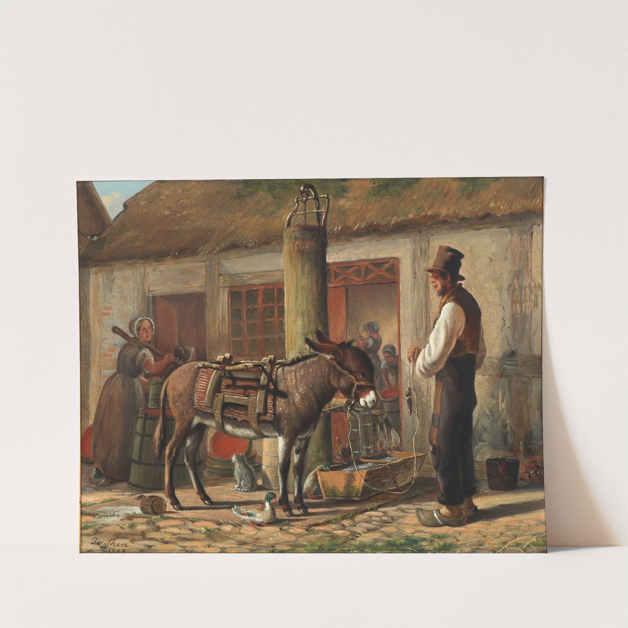 Gårdeksteriør med figurer og dyr omkring vandtruget by Christian Olavius Zeuthen - Wall Art Print
