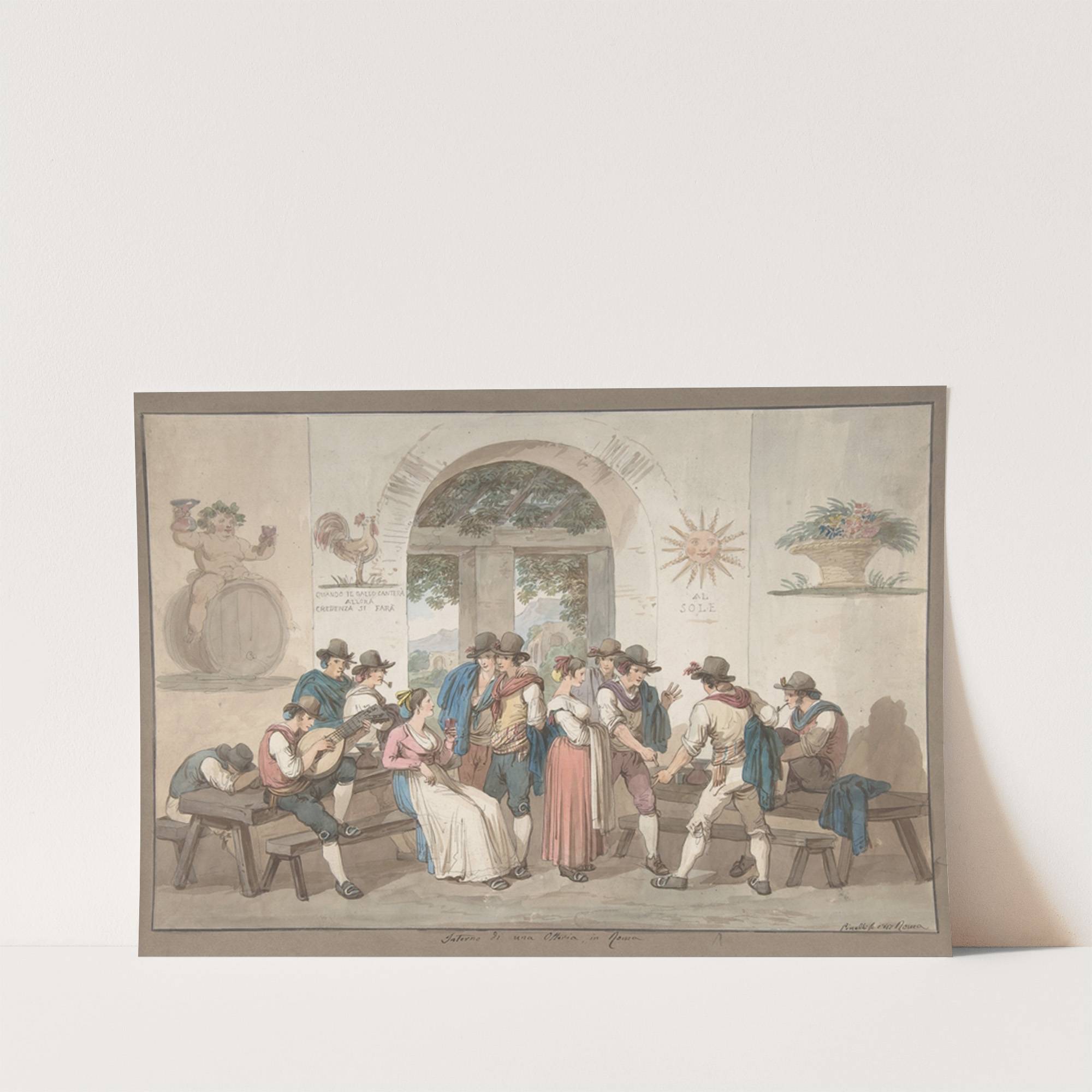 This charming watercolor painting captures a lively scene set in the interior of a rustic Roman inn. The artist, Bartolomeo Pinelli, masterfully depicts a group of 10 men and women engaged in various activities around the room. The men, dressed...
