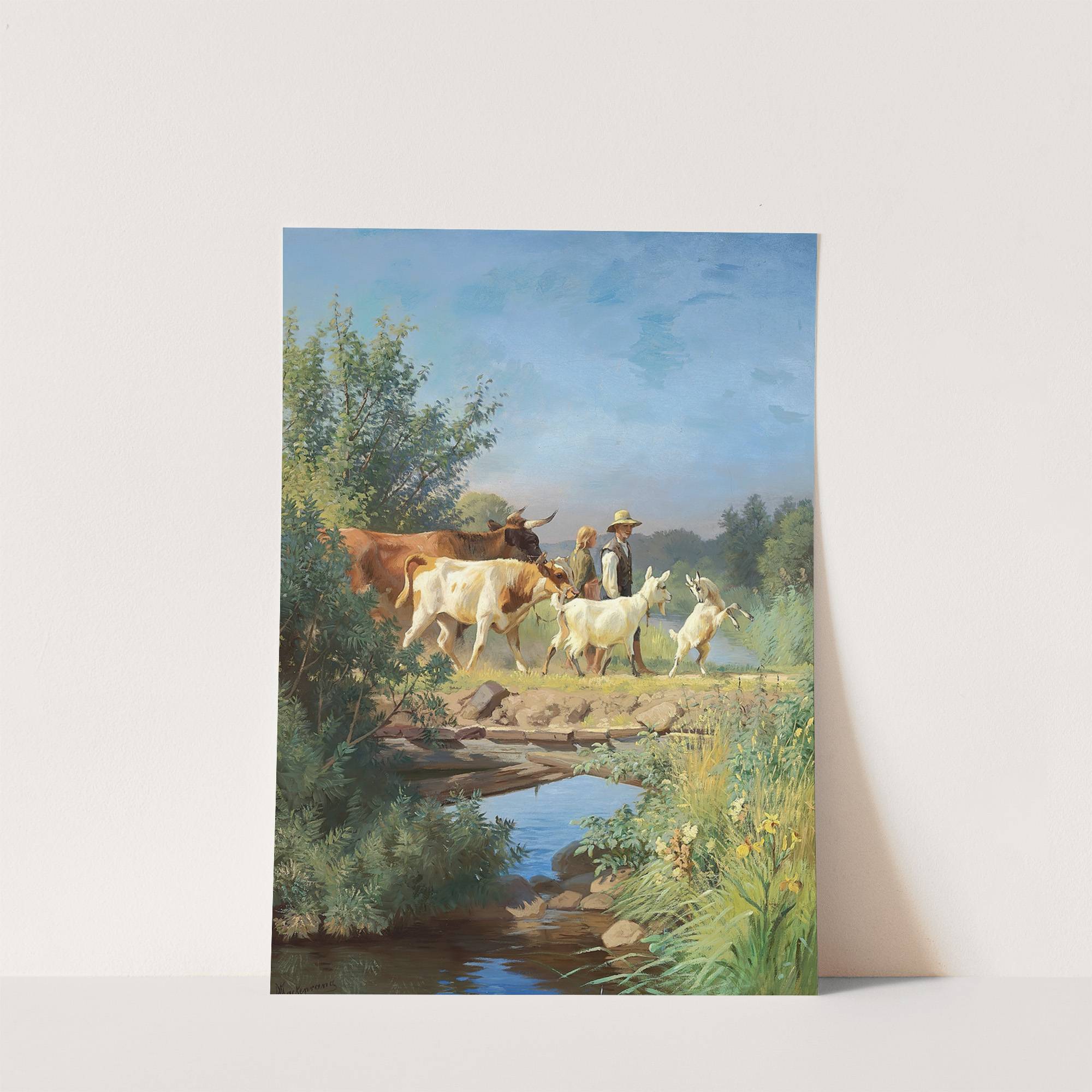This beautiful digital artwork titled "Over Brook" by Adolf Mackeprang captures a serene pastoral scene with vibrant colors and meticulous details. Three cowboys are herding a mix of brown and white cattle across a rustic wooden bridge that spans a...