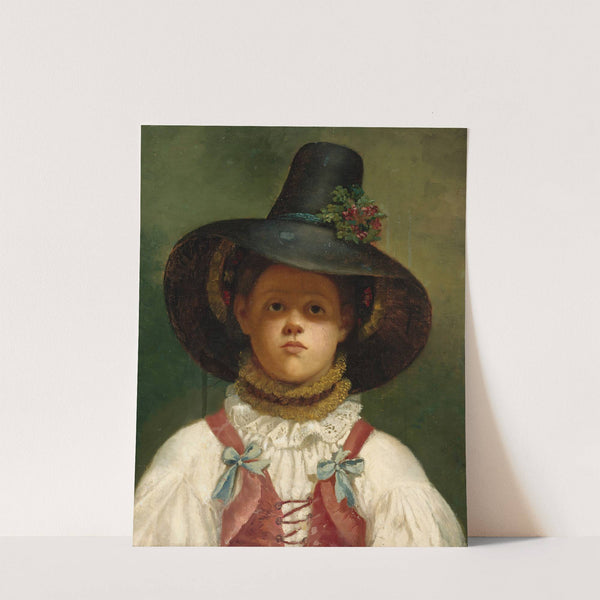 This beautiful art print features "Return from Haymaking on the Alpine Pastures" by Adolf Lübeck. The portrait showcases a young child with fair skin and rosy cheeks, gazing directly at the viewer with an innocent expression. The child is adorned...