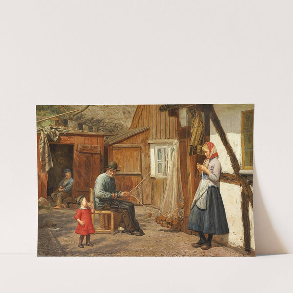 Ung pige i samtale med en fisker, der bøder garn uden for et hus by August Schiøtt - Wall Art Print