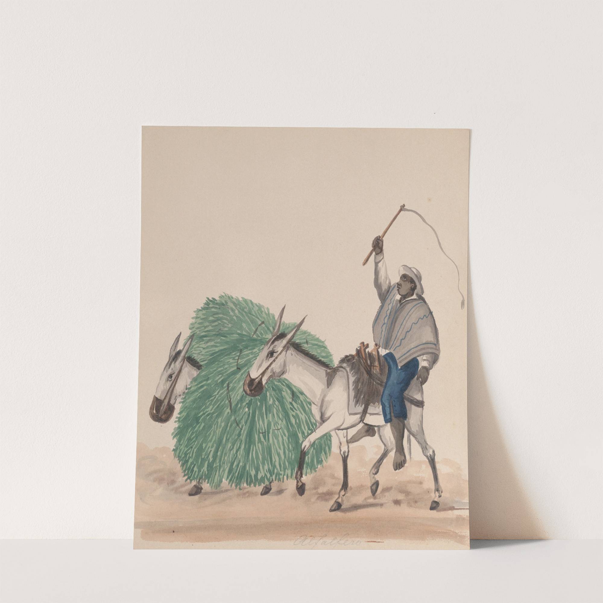 A man riding a mule, his whip raised, another mule loaded with grass alongside by Francisco Fierro - Wall Art Print