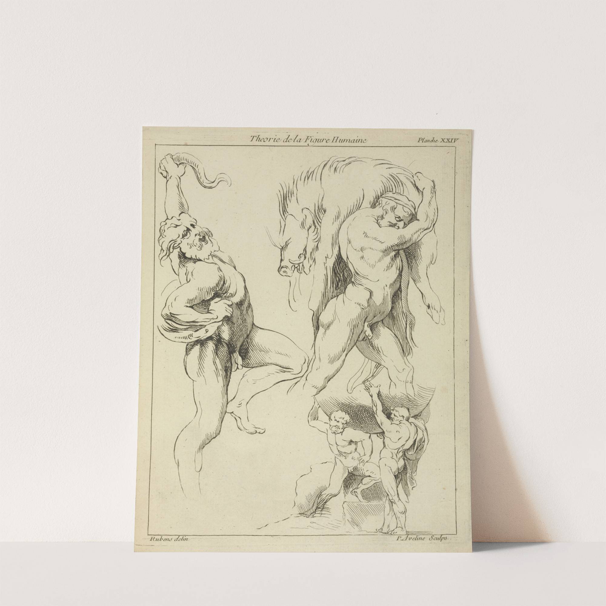 Four studies of figures; one wrestling with a snake, one lifting a dead boar, and two ‘Atlas’ figures lifting a globe by Peter Paul Rubens - Wall Art Print
