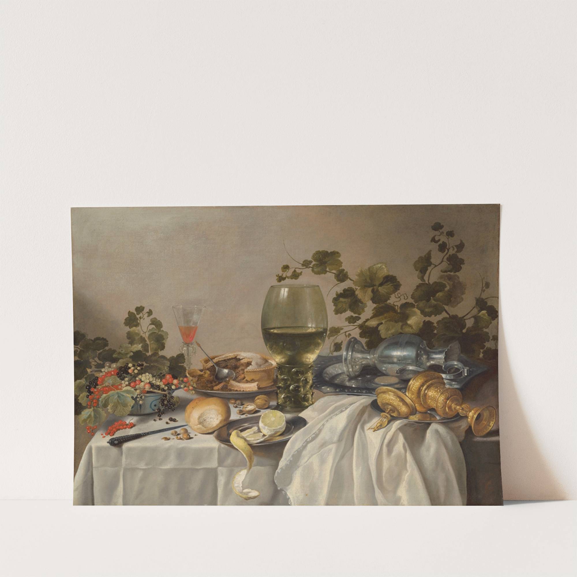 Ontbijt of silver and glassware on a draped table, with vines, fruits and baked goods by Pieter Claesz - Wall Art Print