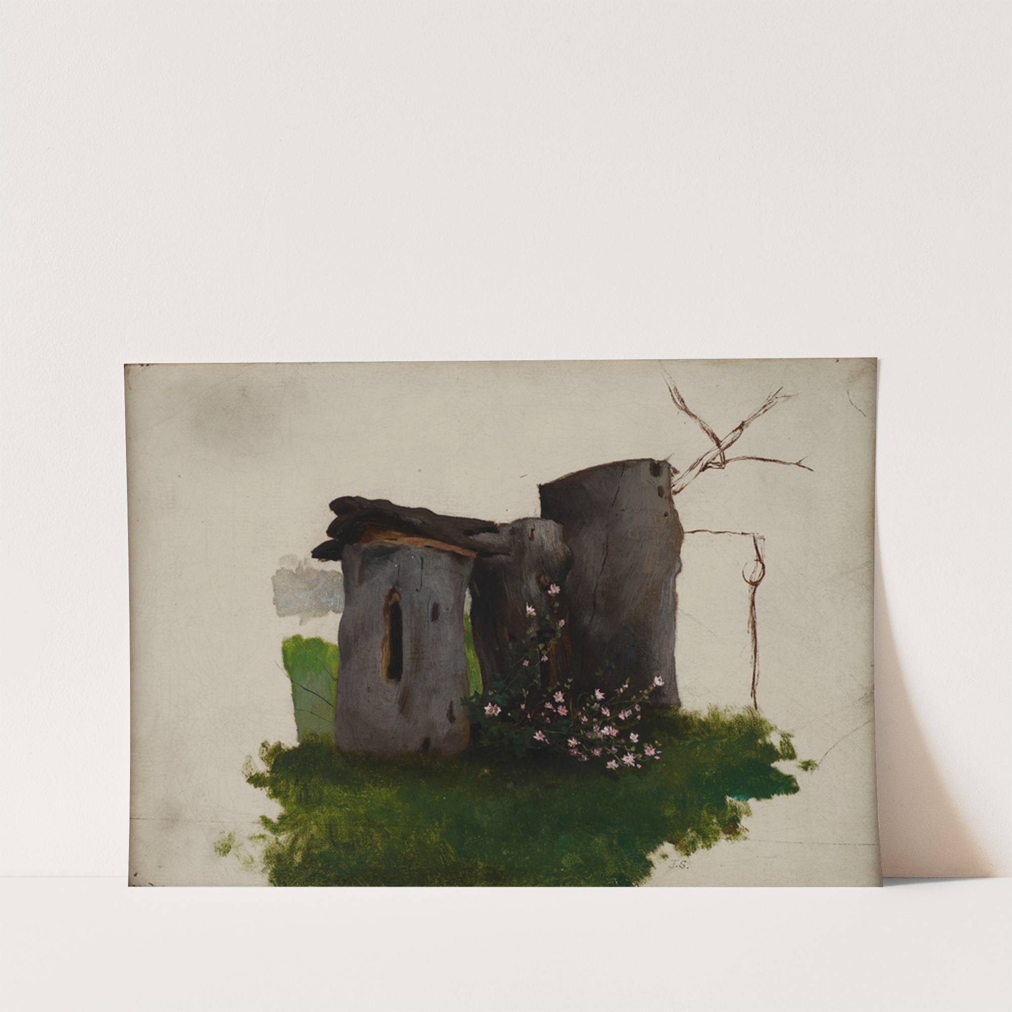 "Behives" is a captivating art print by Jan Stanislawski, showcasing a beautifully textured and evocative scene. This piece features a pair of ancient stone ruins standing tall amidst a backdrop of lush greenery. The weathered stones are depicted in shades...
